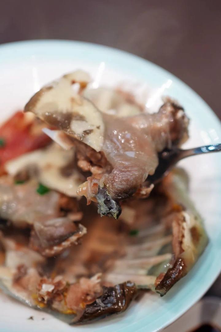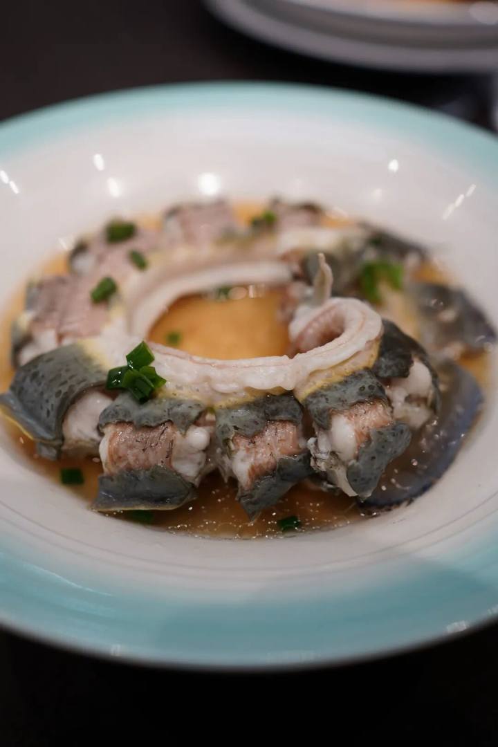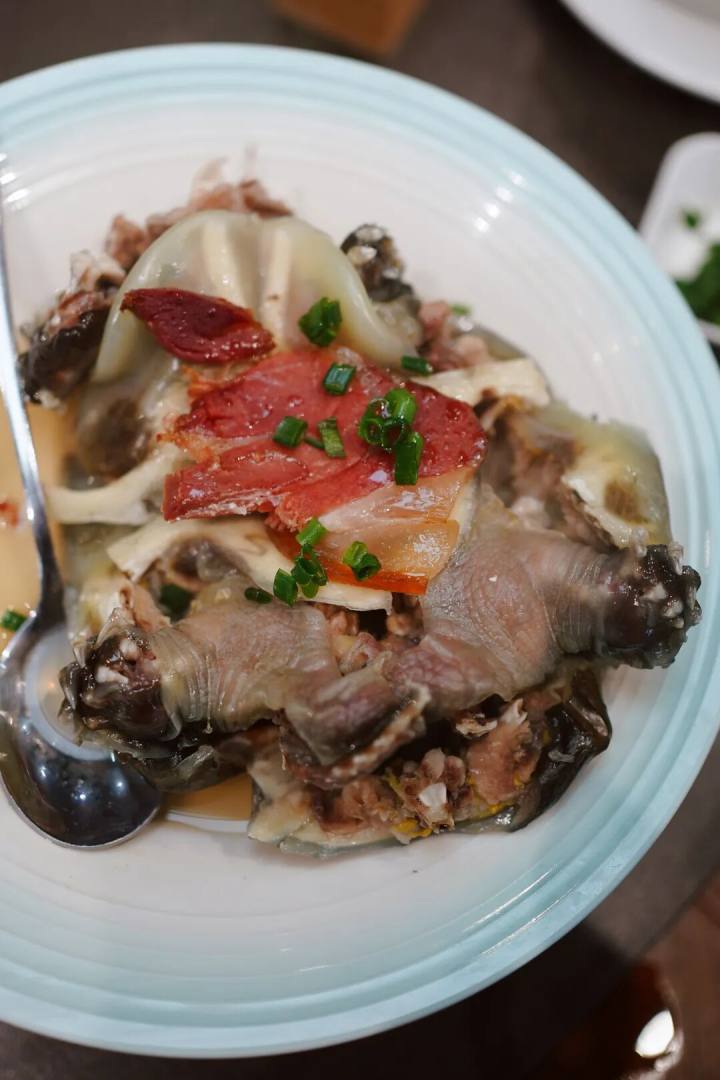 甲鱼品质好,做法至简,用火腿片清蒸一下,甲鱼缩起来,就好了。