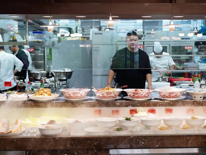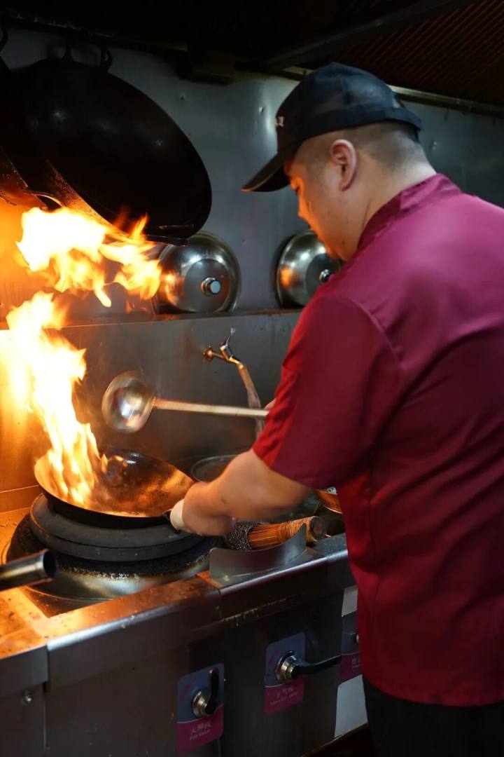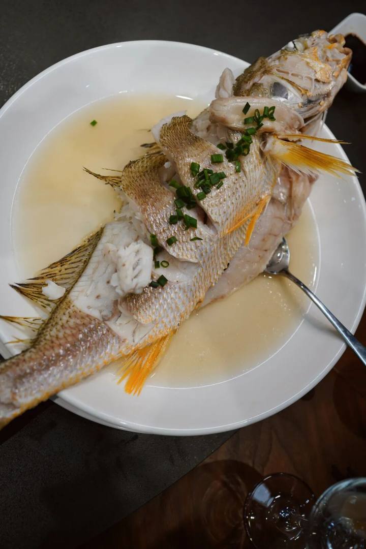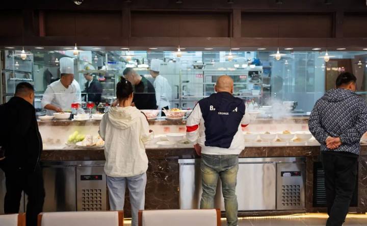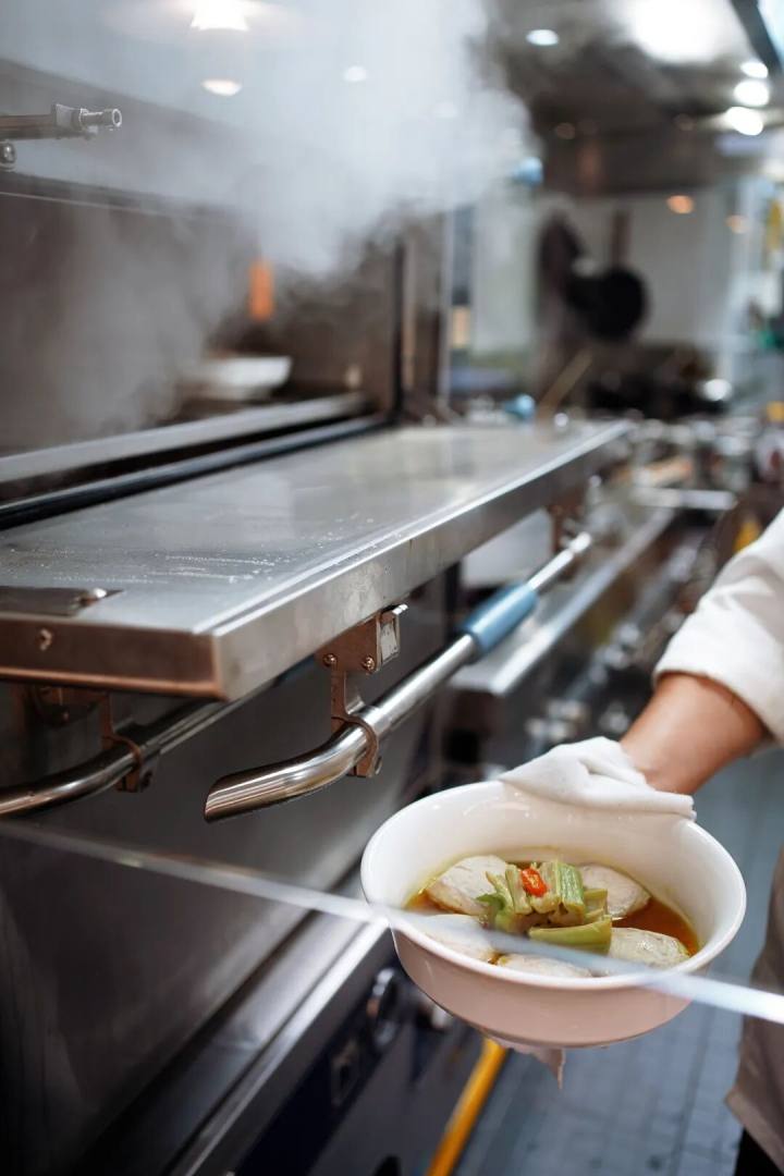 整个厨房是全透明的,客人进来就可一目了然,明档也是,水陆铺陈,条理清爽,明档和厨房就隔块玻璃半墙,最短的动线,上桌的菜都是热腾腾的,锅气足。