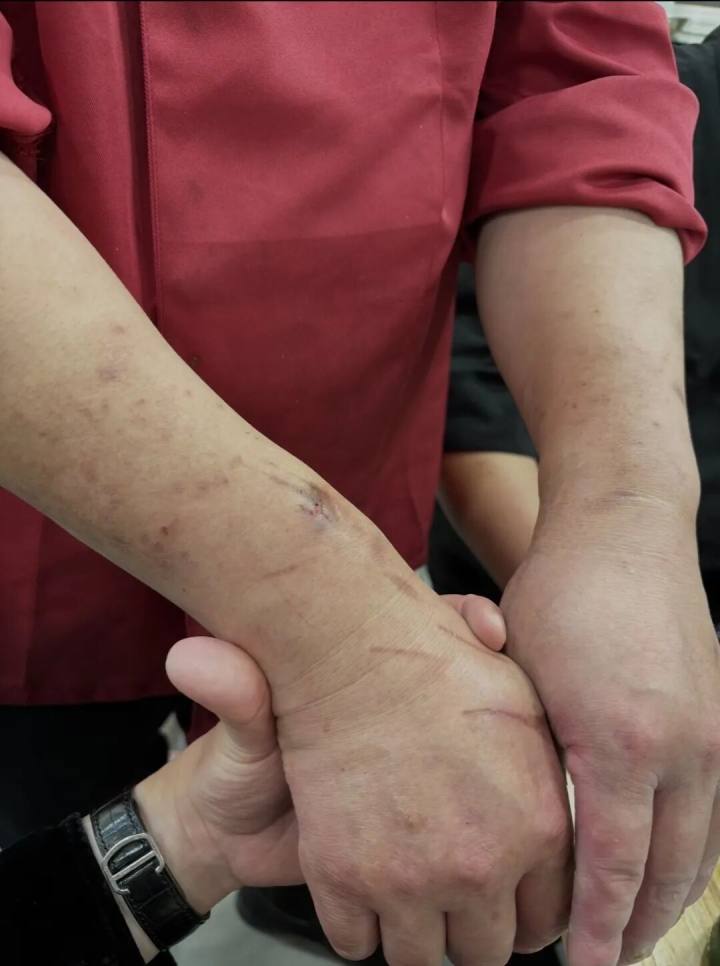 余松两只手臂伸出来全是疤痕,长期烧菜,油星四溅烫的。
