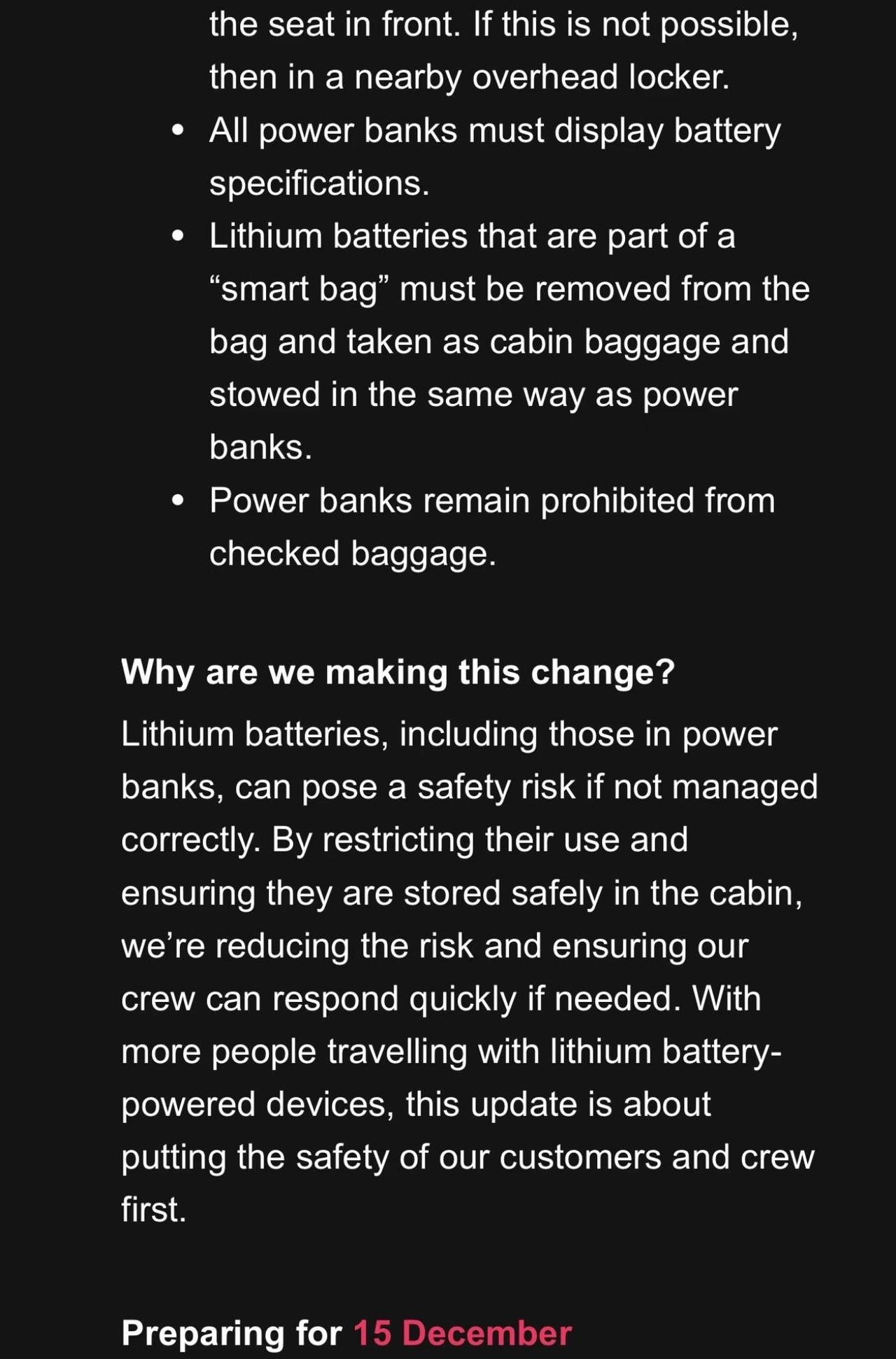 澳大利亚 民航 充电宝 新规 12月15号生效 澳大利亚政府终于对于乘坐民航飞机的乘客携带的充电宝开始做出限制和管理。 刚刚出台了一揽子的管理规定预计于12月15日开始生效。 规定涵盖了旅客乘坐飞机时如何存放充电宝,如何(禁止)使用充电宝以及对充电宝种类和规格做出了明确的规定。 看准日期 2025年12月15日生效。 Qantas qantas航空 澳洲航空 澳洲航空QANTAS