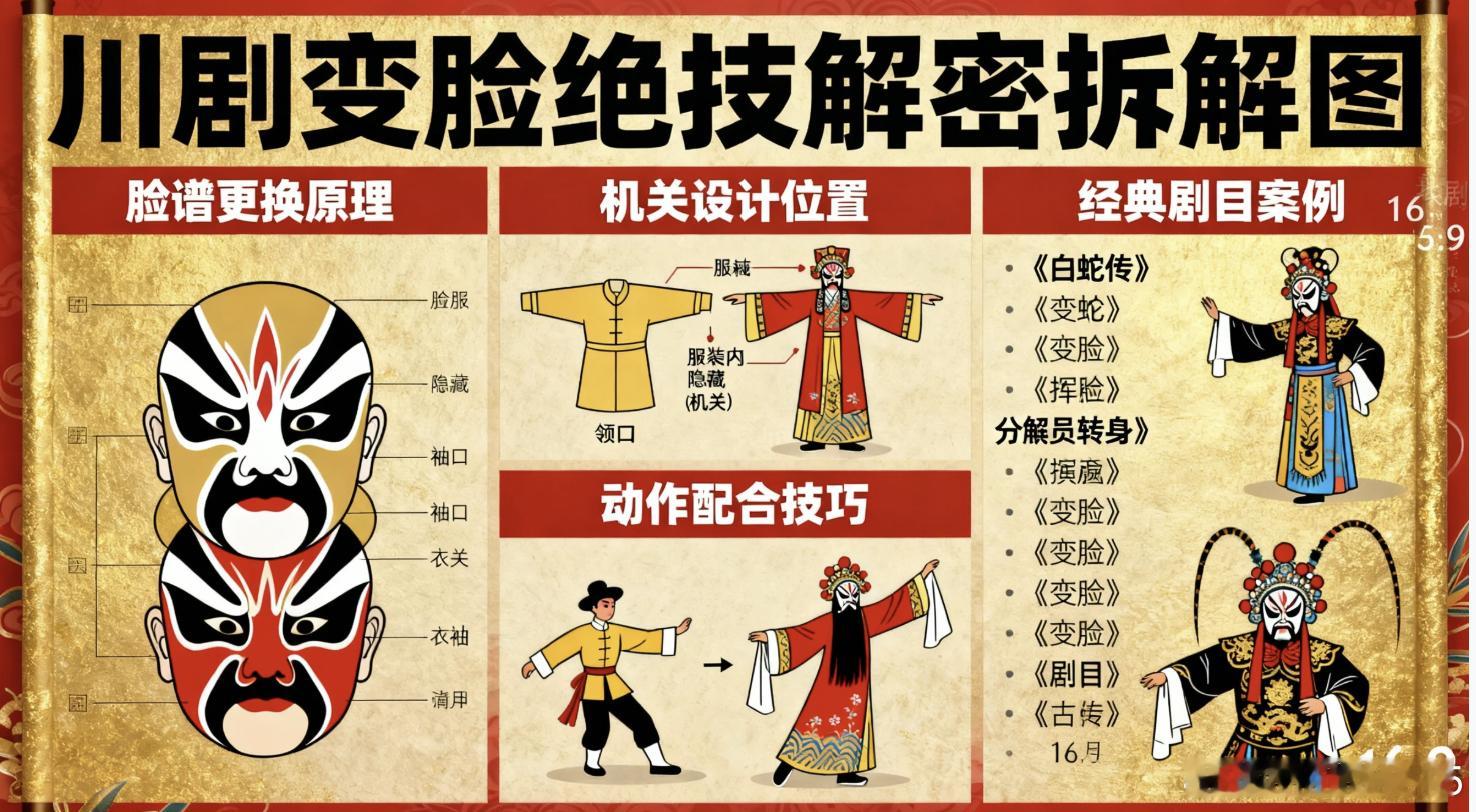 Nano Banana Pro (gemini-3-pro-image-preview) 提示词:(图一)生成一张中国川剧变脸这门绝技的解密拆解图,中文字体不要变形。宽高比16:9同样的提示词,我让即梦做了一份,结果就是图二