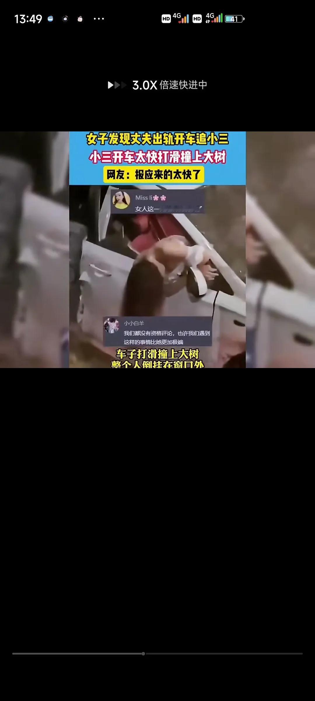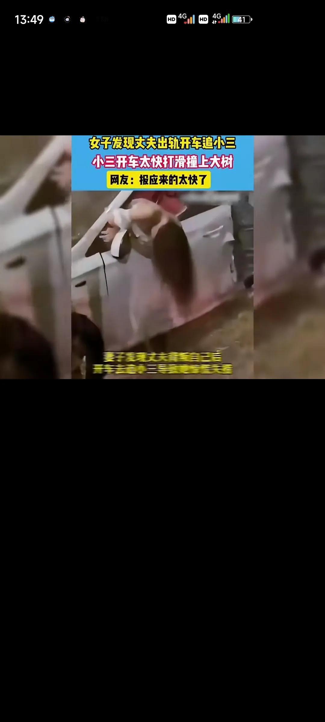 女子发现丈夫的小三开车追,小三慌慌张张的逃跑,不小心开车撞到了树上,半个身子挂车窗外面,当场昏迷。 小三也是,有妇之夫的男人都敢要,还怕人家老婆干啥。 单身优秀的男人多的数不过来,非要看上别人的老公。 还做贼心虚,正大光明的找一个单身好男人不好吗。