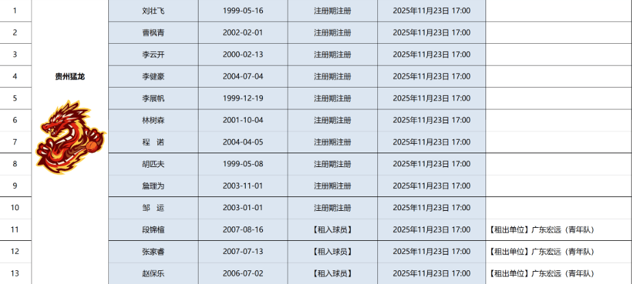 虎扑11月22日讯深蓝体育官方公布新赛季NBL贵州猛龙队注册信息。
