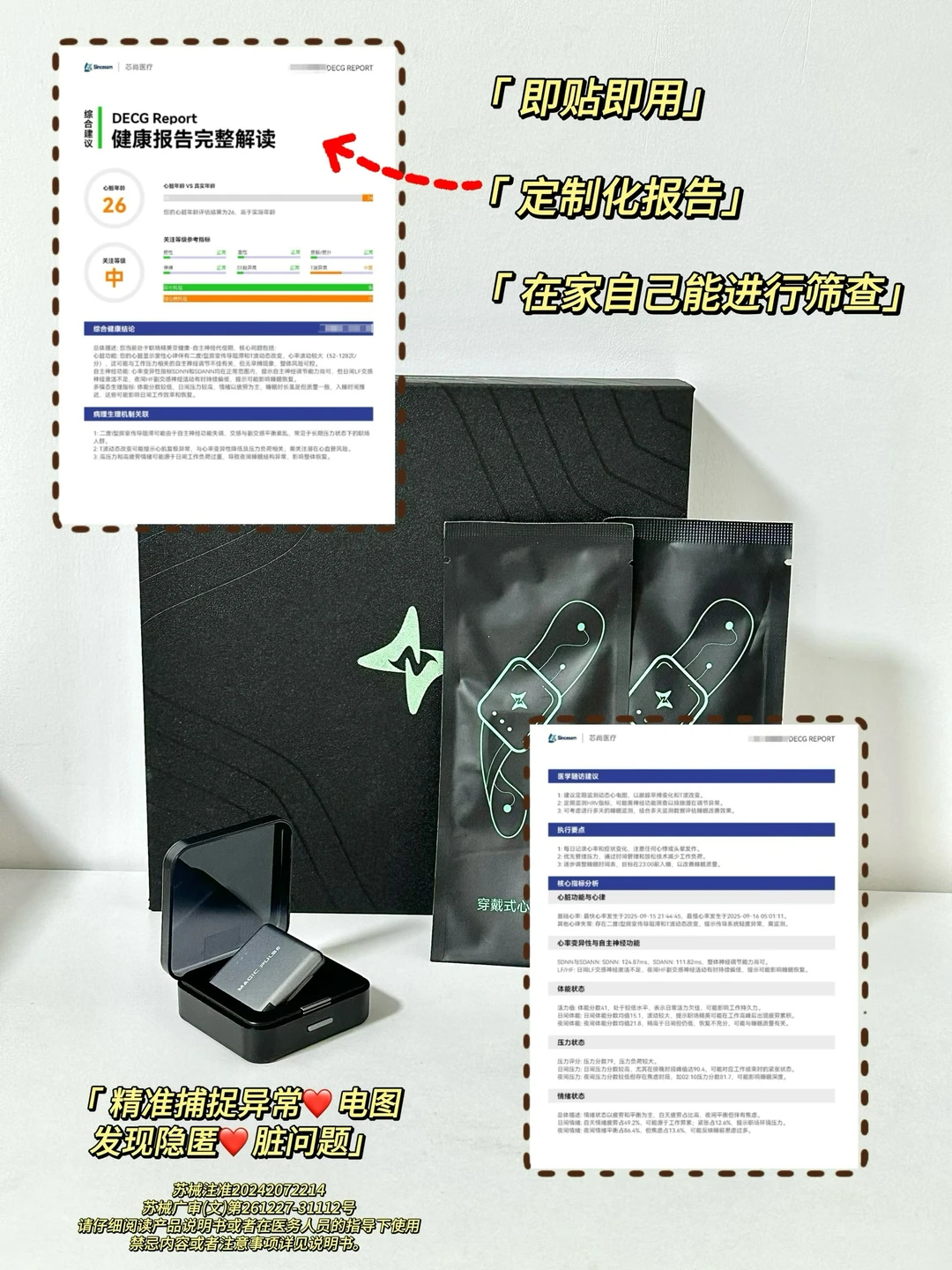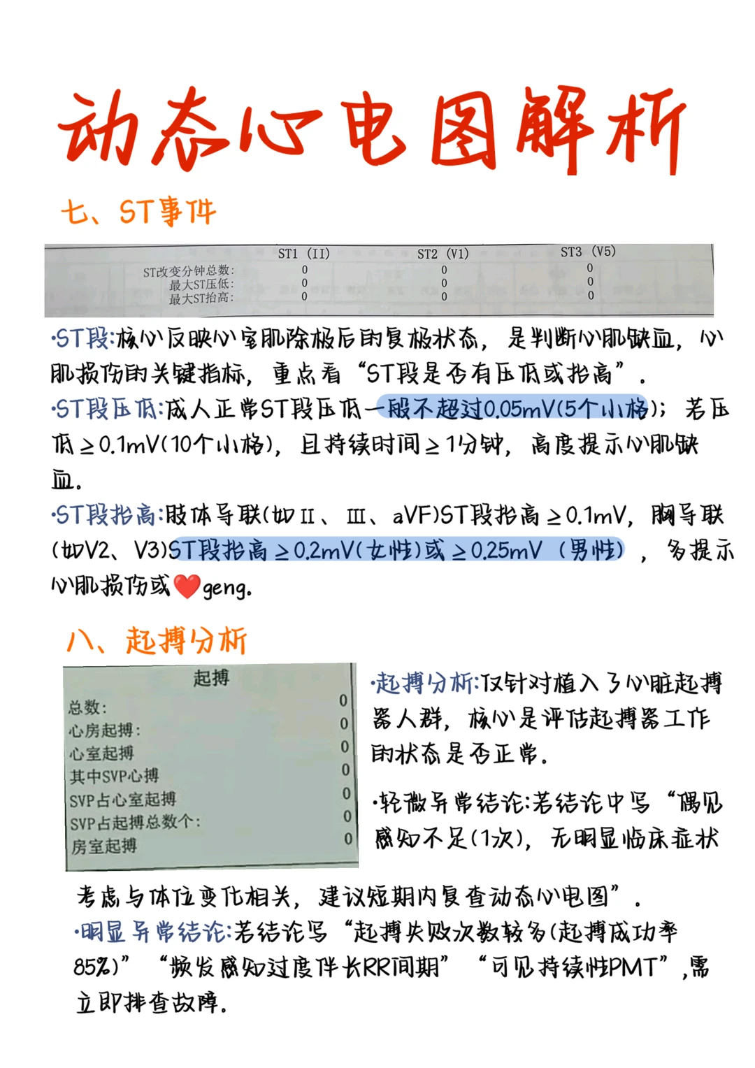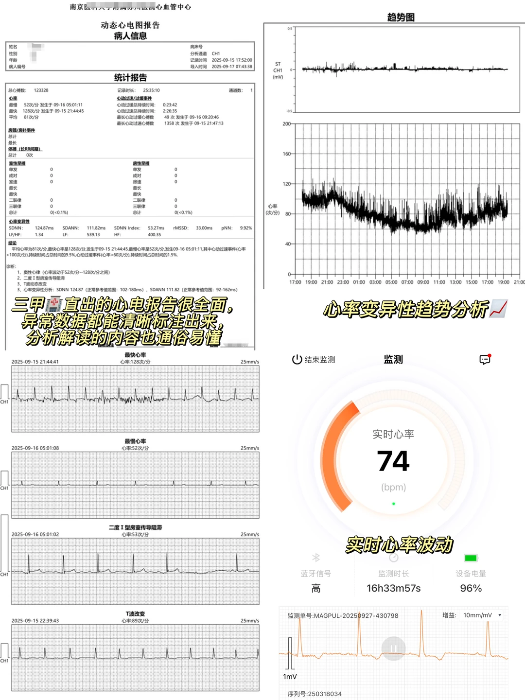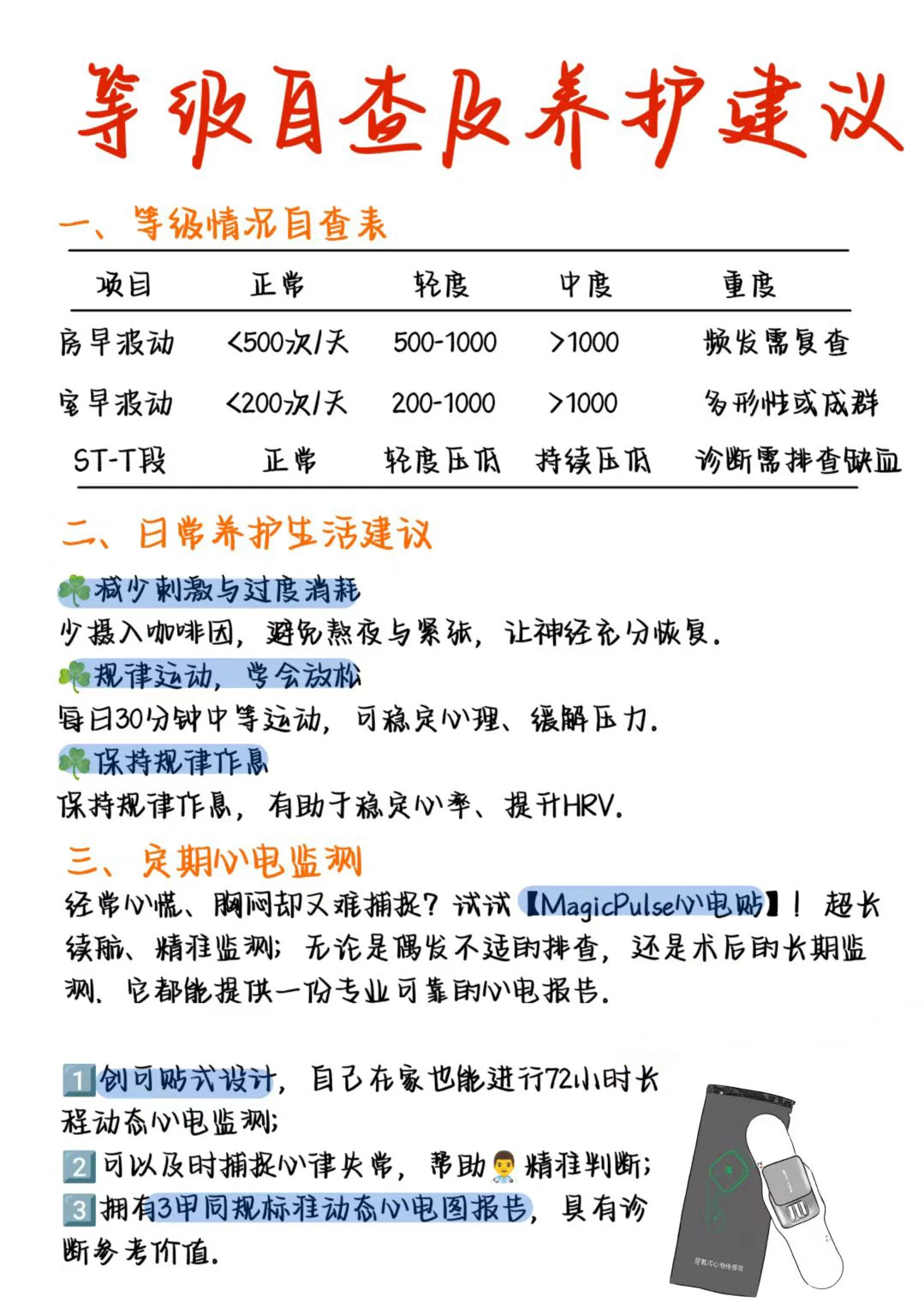 🙋🏻‍♂我是blue,主业学医,副业画画 🎨用图画形式学习医学知识——今天学习“动态心电图解析” 🎈基础资料+概要 ➡ p1 🟢室上性异位搏动+室性异位搏动 ➡ P2 🤔心率变异性+QT分析 ➡ P3 ▪ST-T改变事件+起搏分析 ➡ P4 🔍 典型表现解读: ▫ 窦性心律 → 心脏规律跳动,完全正常 ▫ 偶发早搏 → 偶尔的“抢拍”,多数无需紧张 ▫ 心房颤动 → 需要专业评估与持续关注 ▫ ST段变化 → 注意排查心肌供血情况 🚨【出现以下情况请重视】 ▫ 清醒时心率持续<40次/分 ▫ 24小时内早搏超过1万次 ▫ 房颤发作时间长或持续不断 ▫ 心电图显示长间歇>3秒 出现以上情况,建议尽快心内科就诊 突然一阵心慌、胸闷、漏跳感,赶紧跑去医院...结果普通心电图显示:一切正常?! 划重点👉 很多心脏不适都是“瞬时”的,来得快去得也快。 普通心电图是“瞬间抓拍”,没赶上发作自然也就拍不到! 而24小时动态心电图能把你日常生活中的心跳全部记录下来;精准捕捉一过性心律失常和隐匿性心肌缺血! 相较于传统医院监测的流程繁琐,家用的心电监测设备也有更方便的选择:MagicPulse心电贴,它小巧轻便,让你在不改变日常生活节奏的前提下,完成24小时甚至更长时间的心电记录。无论是工作、散步、休息,或是夜间睡眠中的心跳变化,都能被完整记录,利用AI-ECG技术自动筛查出房颤、停搏、早搏等62种异常心律。 - 监测结束后生成的报告,会有专业翳师进行人工复核并签字确认;你收到的不仅是一系列数据,更是一份清晰标示心脏风险等级、异常时段和心率变异性趋势的可视化结果,在手机上能清楚看到不同状态下的心电表现,甚至了解睡眠、压力对心脏的潜在影响。 报告不仅给到了健康理论解读,还有针对性调理养护和干预方案,可以结合自身情况进行调理,很方便。 🎯【给不同人群的建议】 上班族:长期熬夜+心悸?快检查!压力大易引发心律失常! 中老年:关注房颤风险,建议每半年检查一次 运动达人:静息心率偏低属正常,但要排除病理性因素