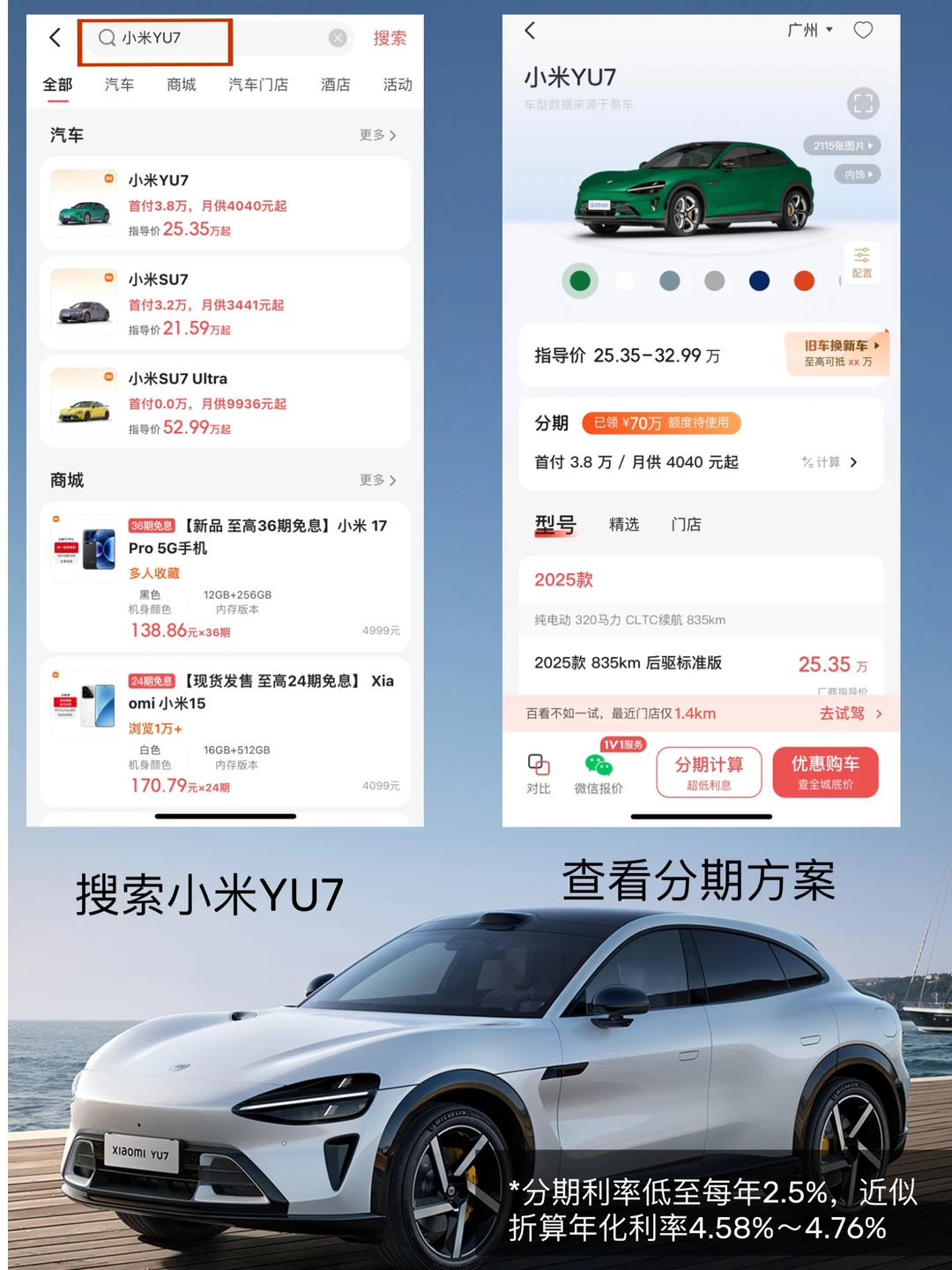 3⃣️怎么分期买小米?💰认准“小米汽车官方金融服务”,每年分期利率低至2.5%,最长分60期慢慢还,首付比例低至15%,压力直接小一半!
