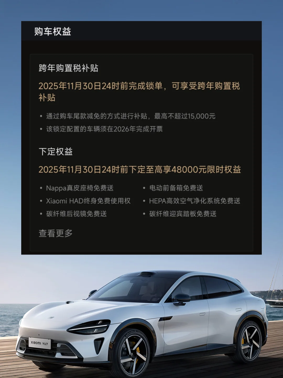 4⃣️什么时候买合适?新能源车26年购置税会减半征收,很多人担心年底买车购置税问题。但小米贴心地提供了跨年购置税补贴!只要在今年11月30日24点前锁单就能享受💰还有4.8万限时权益,真皮座椅、电动前备箱等都免费送,一定要抓住月底的购车时机!