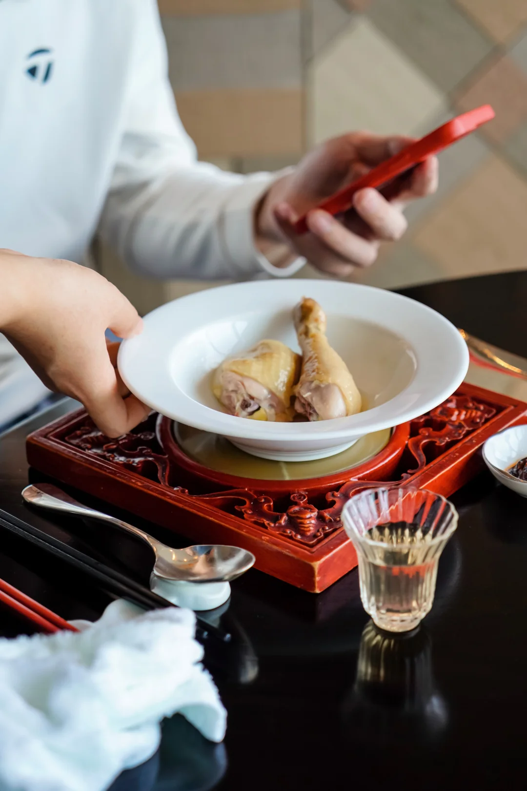 秋日匠心之作啦~ 点餐到上桌需等30分钟左右,湛江香草鸡仅以细盐和纯花生油入味,从锅里拿出来的时候就香气扑鼻。一剪开,鲜嫩多汁,鸡皮莹润如水晶。好好吃🤤喔!!