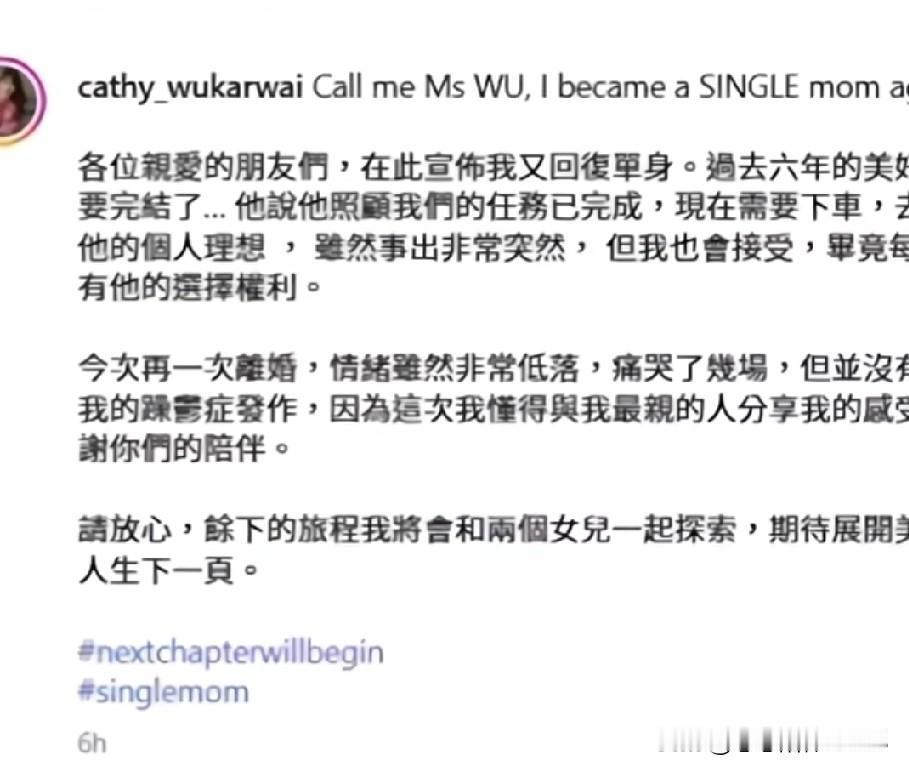 近日, 港姐胡家惠官宣与第二任丈夫离婚, 三年婚姻画上句号。 小姐姐两度闯关婚姻