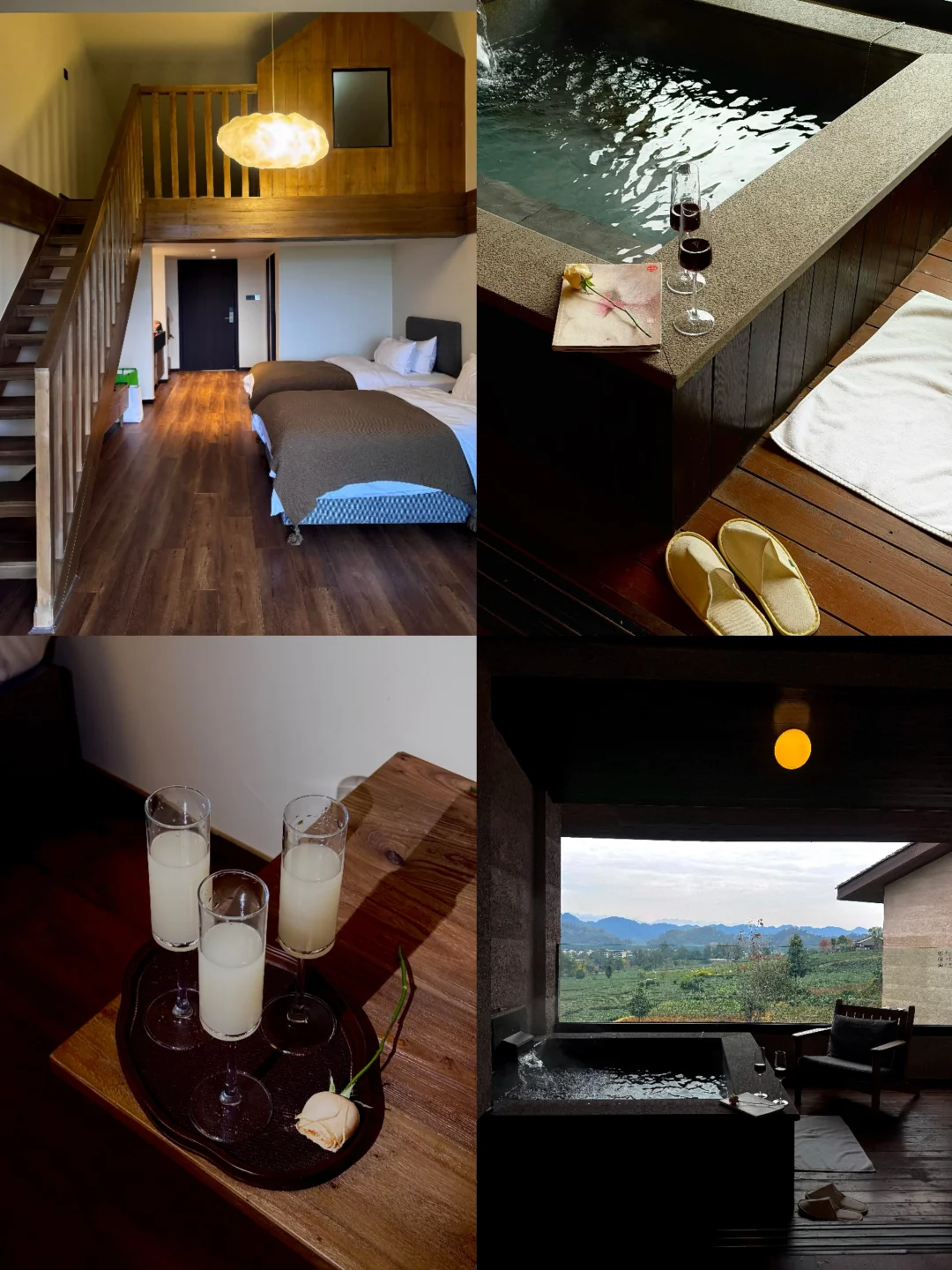 和姐妹👭说走就走的两天一夜逃离城市计划 被邛崃这民宿狠狠拿捏! 全程松弛感拉满,不用挤人太香了~ · 🍃Day1:茶园寻香·私汤解乏 • 下午从成都出发,1.5h直达民宿,车窗外的绿意越看越治愈!办理完入住就冲茶园,体验采摘茶花的乐趣。 • 傍晚回房间泡私汤!开启姐妹泡汤局♨️暖乎乎的汤池泡走工作一周的疲惫,泡着汤看山景,连风都是甜的,舒服到不想起身~ • 深夜在民宿有准备晚安微醺是一种度数较低的米酒送到房间(仪式感拉满),晚风混着茶香,微醺状态下和姐妹聊到深夜🥂幸福感拉满✌️ · 🚴Day2:骑行逛古镇·躺平放空 • 上午:睡个懒觉,在民宿借辆自行车,慢悠悠的骑到夹关古镇,赶集拍照都非常惬意(每到节假日古镇都有各种活动,水上集市,水上打铁花各种活动) • 中午:窝在民宿水台喝茶发呆,看青瓦屋顶置映在水面,拍几张氛围感大片,连风都裹着松弛感~ ✅姐妹局必冲: ✔️私汤是真私密,谁泡谁舒服 ✔️采茶+骑行都是民宿专属,不用人挤人 ✔️民宿设计超有质感,随便拍都是氛围感大片 💡Tips:记得穿浅色系衣服,茶园和水台都巨巨巨出片