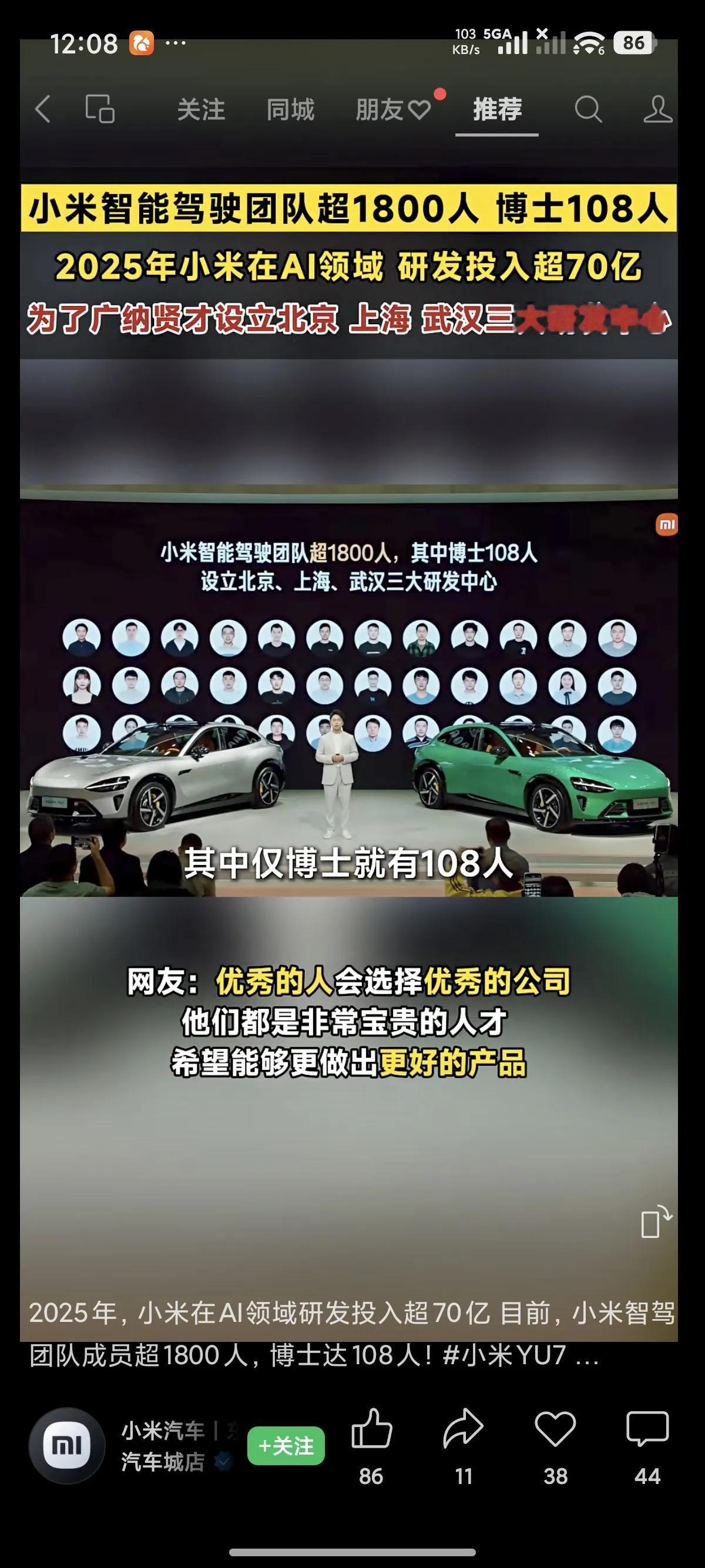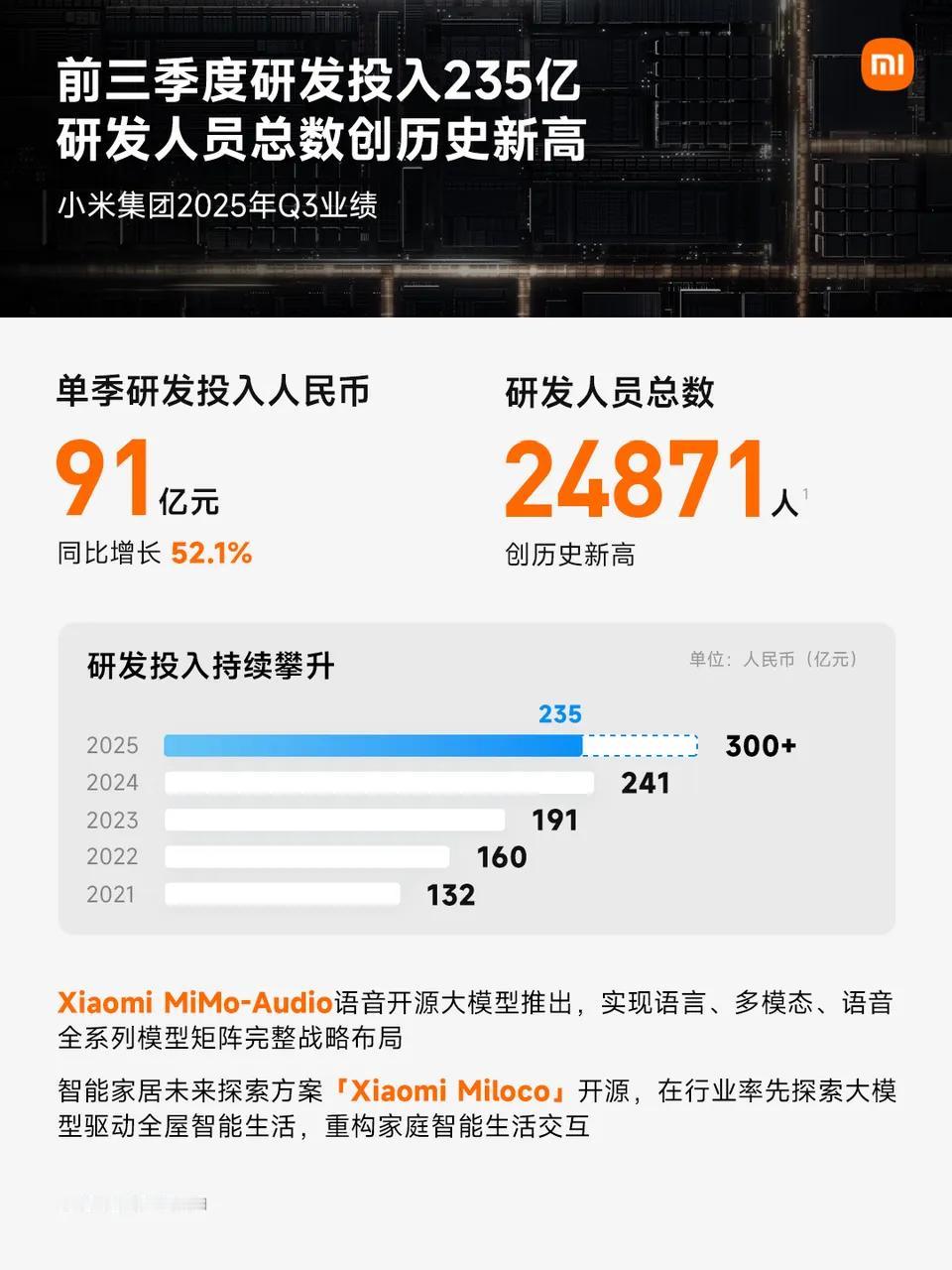 小米公司未来前景广阔,其投资价值值得关注。从研发投入来看,今年小米的研发投入将超过300亿。2024年,其研发投入同比增长25.93%,达到240.5亿,研发强度为6.57%。2025年度,在消费电子及电气业中,小米超越美的,跃居研发投入榜首。 在人才方面,2024年研发人员数量同比增长19.04%,达到2.12万人。汽车业务是研发投入的重要驱动力,2021 - 2024年的研发费用占过去10年投入的七成以上。2025年第三季度,智能电动汽车及AI等创新业务分部首次实现单季盈利。鉴于如此高的投入和良好的表现,小米未来发展潜力巨大,投资小米或许是个不错的选择。小米如何走上高端之路?