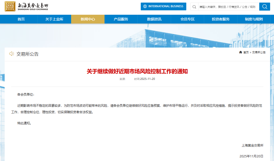 11月20日,上海黄金交易所发布《关于继续做好近期市场风险控制工作的通知》(以下简称《通知》)。