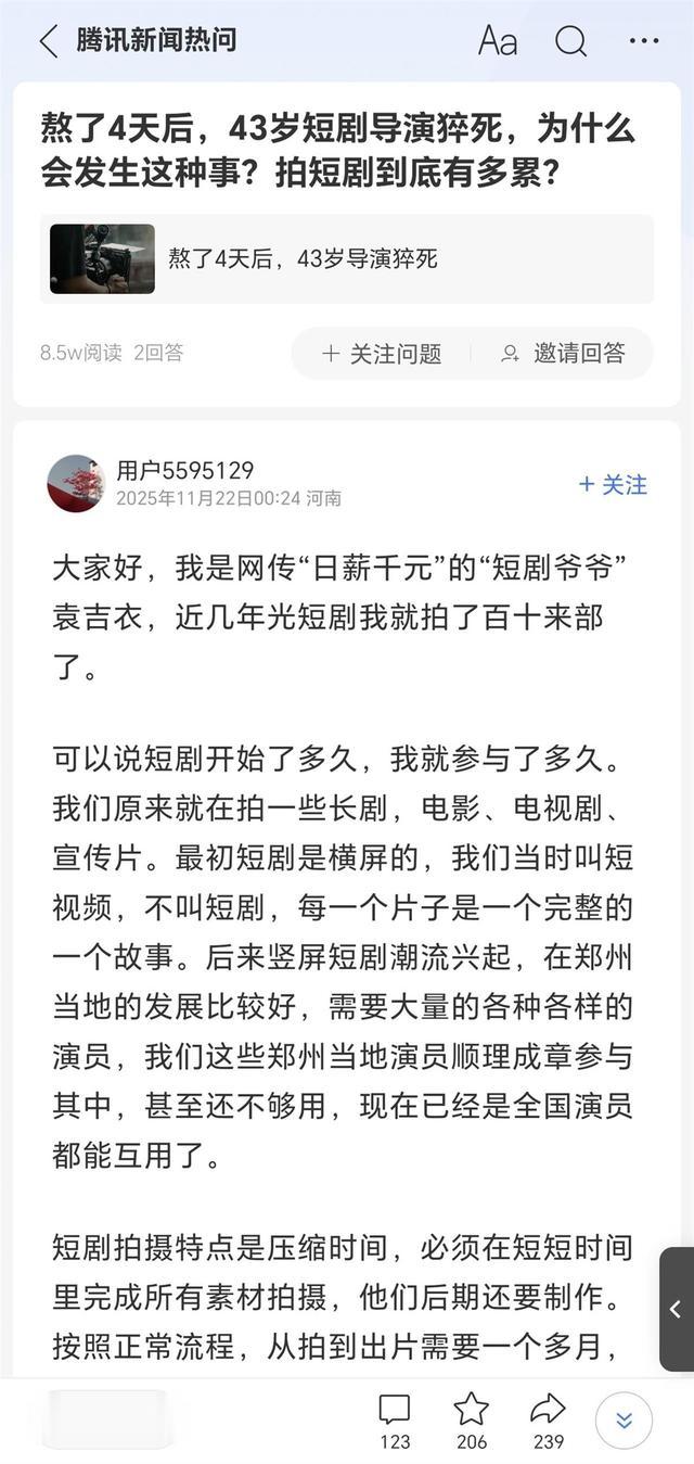 熬了4天后,43岁短剧导演猝死,为什么会发生这种事?拍短剧到底有多累?11月22日0时24分,网传“日薪千元”的“短剧爷爷”袁吉衣在腾讯新闻“热问”发声,分享了自己拍短剧的经历。22日上午,袁吉衣在接受极目新闻记者采访时说,短剧演员每天工作14-16小时是常态,导演和场务更辛苦,希望短剧行业能在从业者身体健康的前提下健康发展。