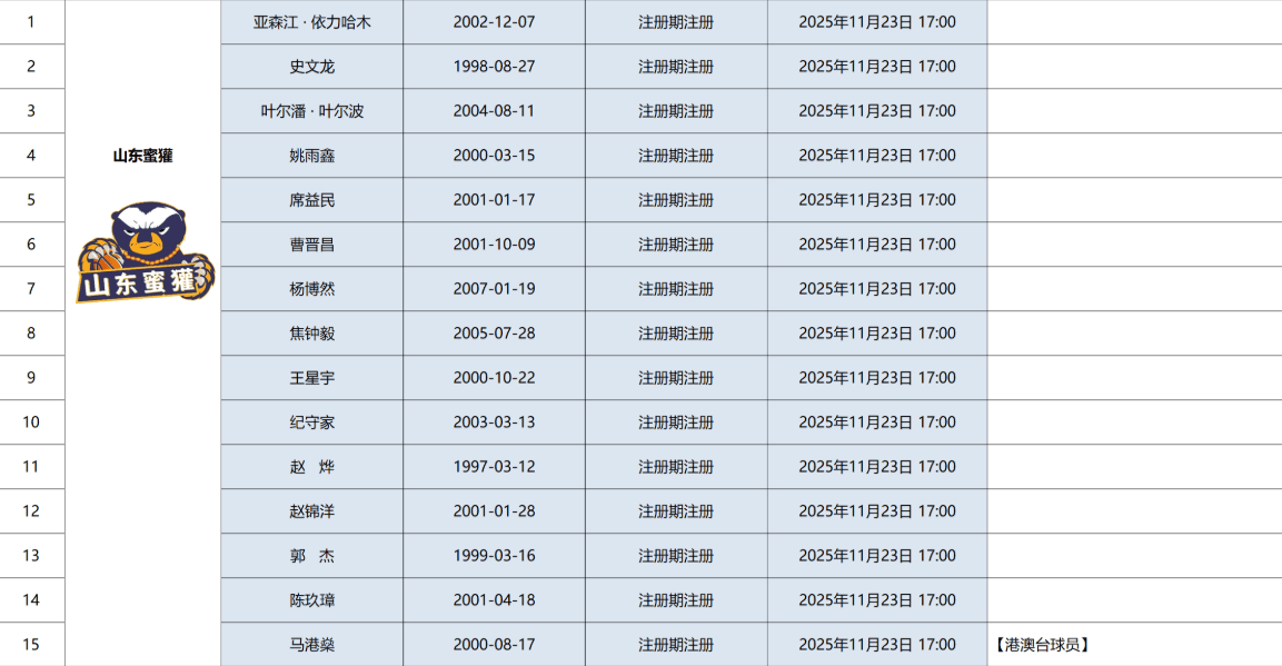虎扑11月22日讯深蓝体育官方公布新赛季NBL山东蜜獾队注册信息。