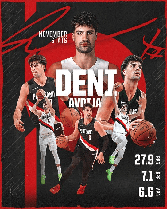赛后,开拓者官方发布阿夫迪亚11月数据,场均可以得到27.9分7.1篮板6.6助攻。