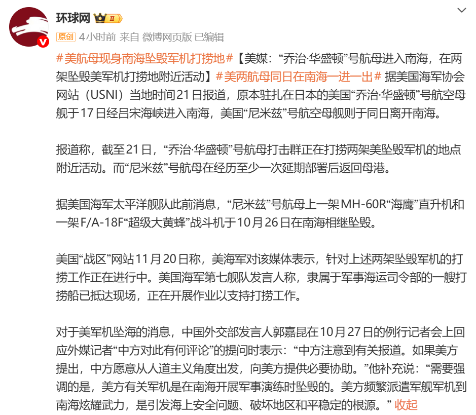 据环球网,美国海军协会网站(USNI)当地时间11月21日报道,原本驻扎在日本的美国“乔治·华盛顿”号航空母舰于17日经吕宋海峡进入南海,美国“尼米兹”号航空母舰则于同日离开南海。