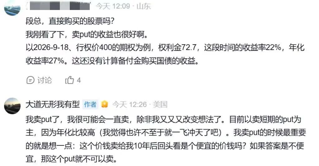 另有网友询问段永平是直接购买股票,还是卖Put。段永平表示:“我卖put了,我很可能会一直卖,除非我又又又改变想法了。目前以卖短期的put为主,因为年化比较高(我觉得也许不至于就一飞冲天了吧)。我卖put的时候最重要的就是想一点:这个价钱卖给我10年后回头看是个便宜的价钱吗?如果答案是不便宜,那这个put就不可以卖。”