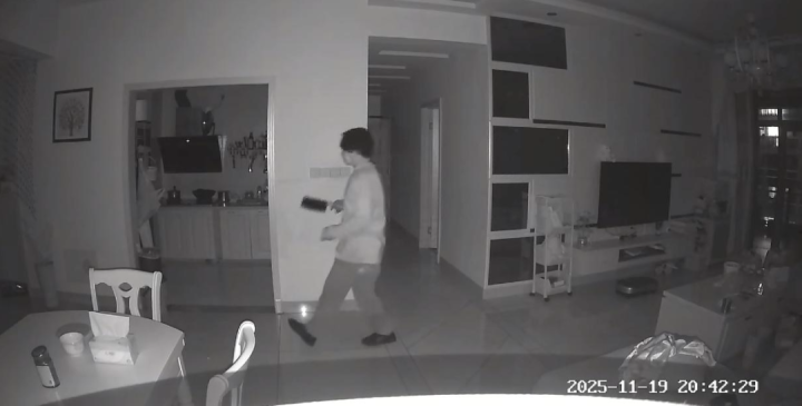 小区居民发布的一段家中监控视频显示,19日晚8时40分许,一名小偷从厨房走出,持手电筒四处窥探,随后从厨房取出一把菜刀,走向卧室门口。在发现房内有人后,其立即蹑手蹑脚退回,将菜刀放回原处后悄然离去。约一小时后,一名身穿居家服的男子从卧室内走出,开灯并用手机查看监控记录。