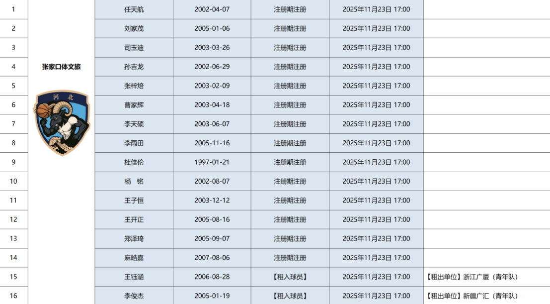 虎扑11月22日讯深蓝体育官方公布新赛季NBL张家口体文旅注册信息。