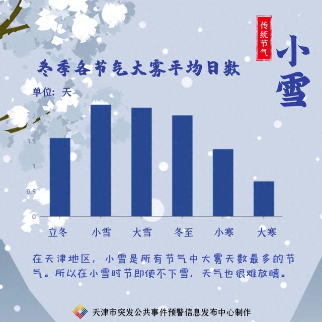 小雪节气也是天津地区大雾天气的“高发期”。统计数据表明,在全年二十四节气中,小雪节气期间天津的大雾天数最多。