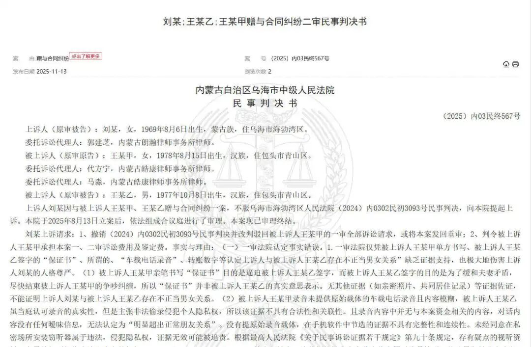 王某甲愤而起诉,要求确认该赠与行为无效,并全额返还财产。在法庭上,王某甲提交了三组关键证据:一是王某乙亲笔签名的“保证书”,承认与刘某“男女不正当关系已有十几年”;王某乙在保证书中写道:“由于我的出轨给我的妻子造成了很深的伤害,从此我和刘某保证不再来往,一刀两断,我要回归家庭。”二是一段“车载录音”,在录音中,王某乙称呼刘某为“老婆”“傻老婆”,语气亲密;三是转账记录,王某乙多次在情人节、“520”、刘某生日等日期,给刘某转账“52”“520”等具有情感寓意的金额。