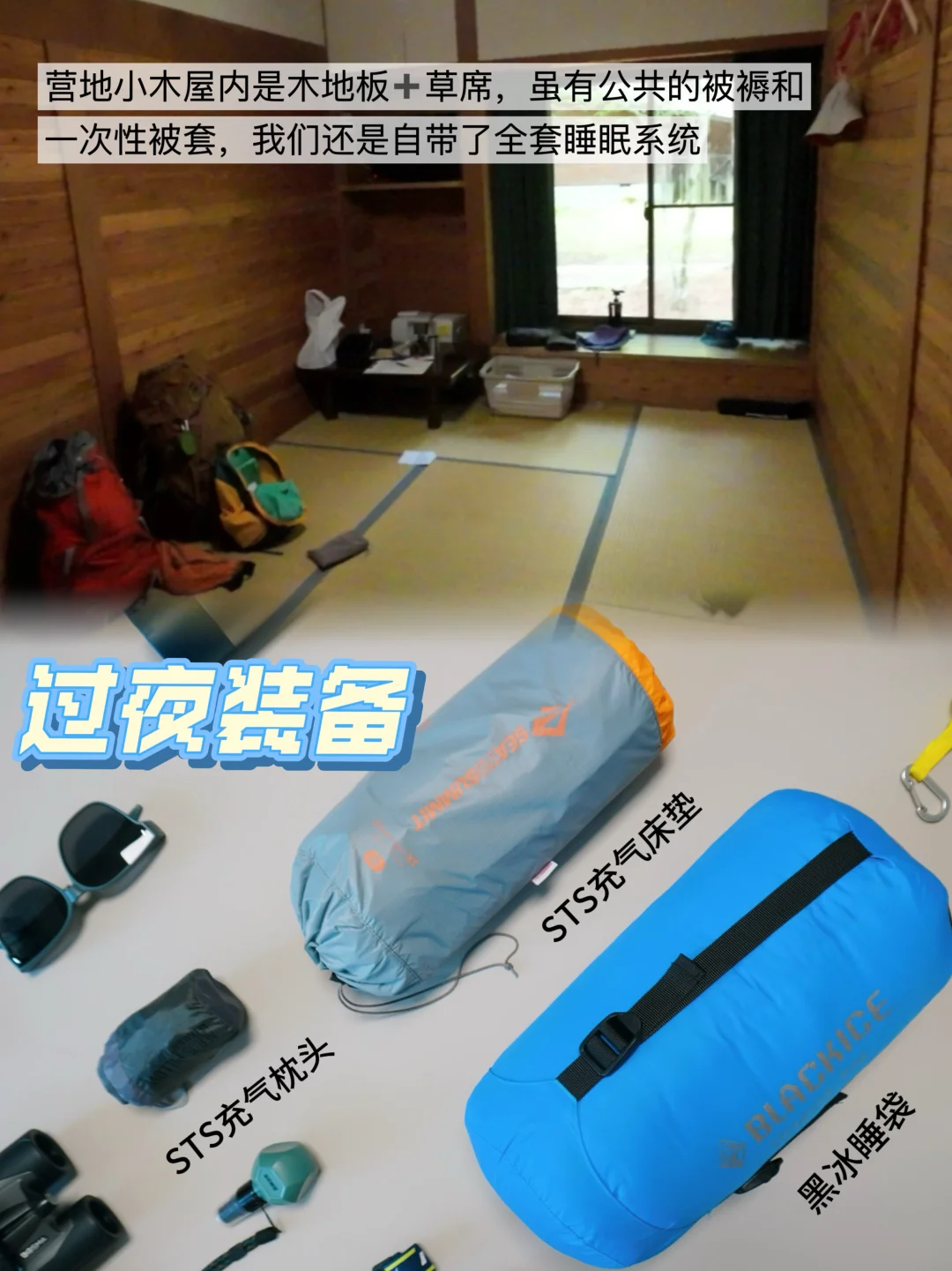 👉木屋内是木地板➕草席,营地提供公用的被褥和一次性床单床罩,也可以像我们一样自己带床垫和睡袋。