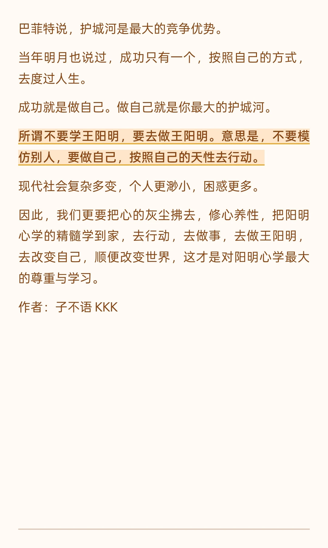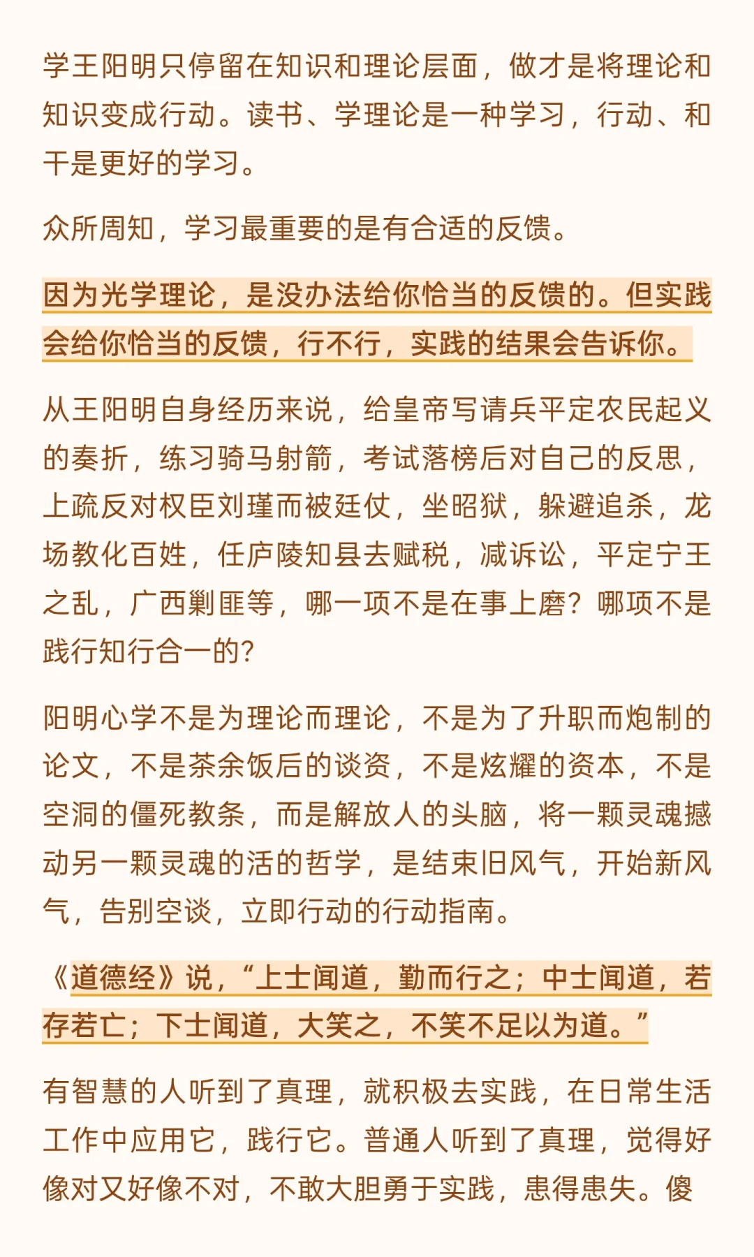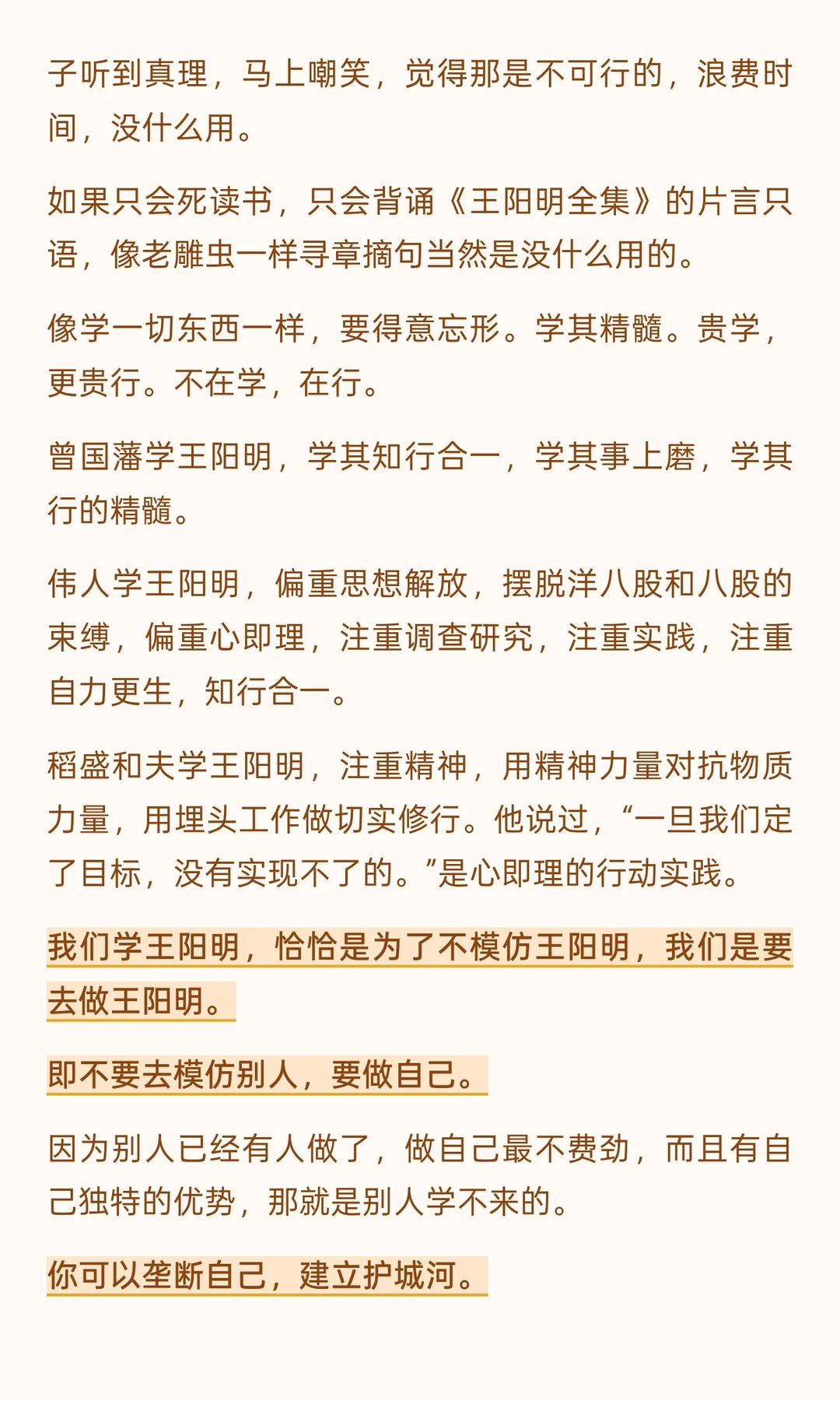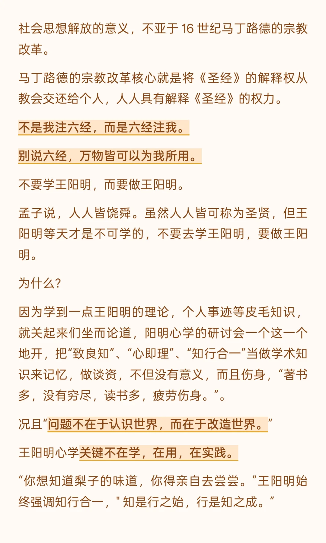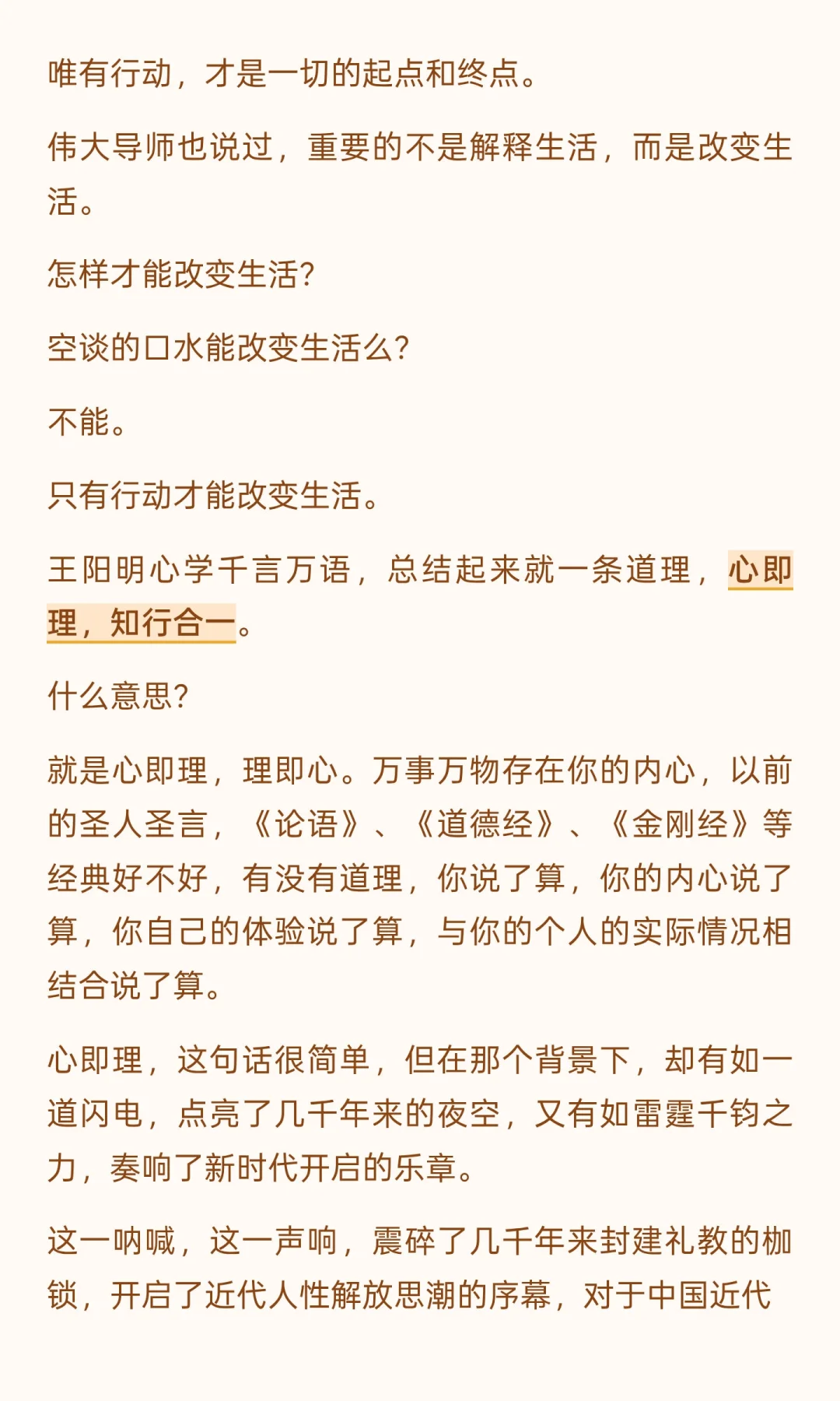 阳明心学不是为理论而理论,不是为了升职而炮制的论文,不是茶余饭后的谈资,不是炫耀的资本,不是空洞的僵死教条,而是解放人的头脑,将一颗灵魂撼动另一颗灵魂的活的哲学,是结束旧风气,开始新风气,告别空谈,立即行动的行动指南。