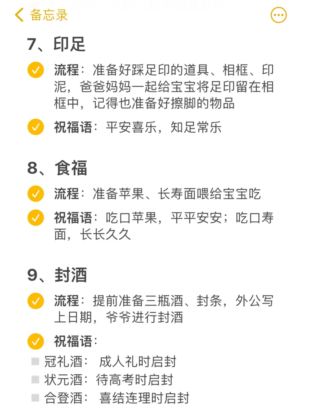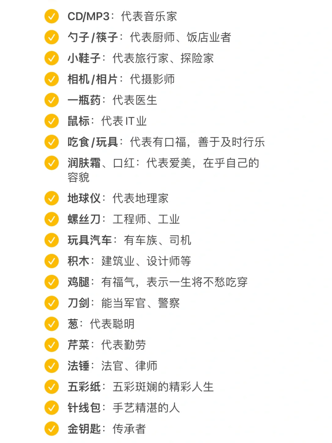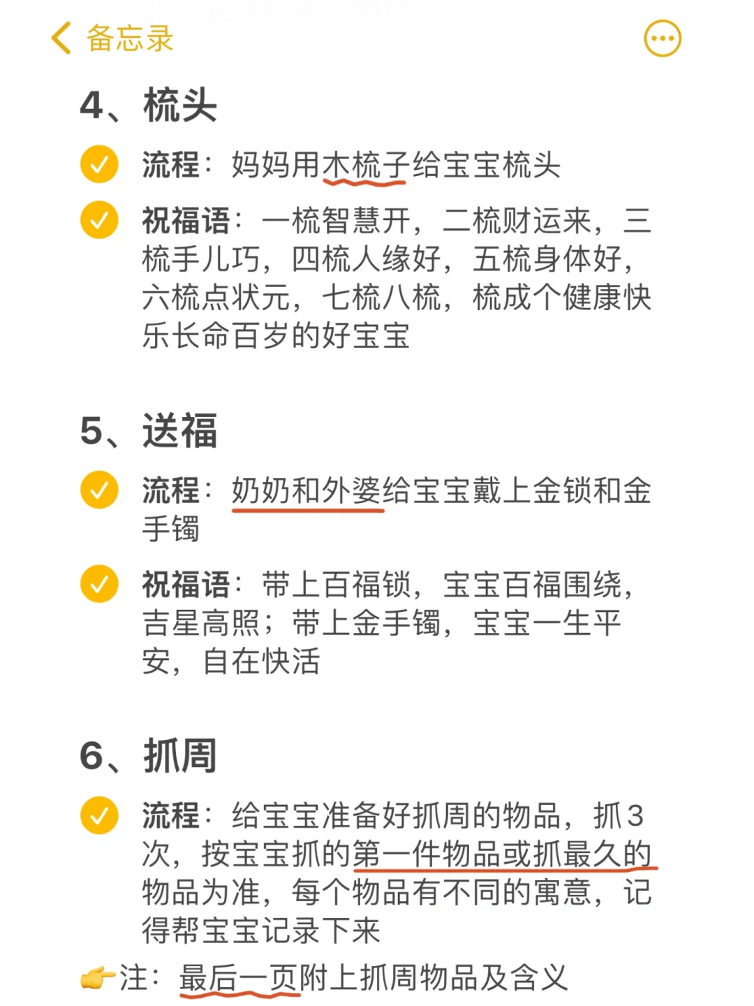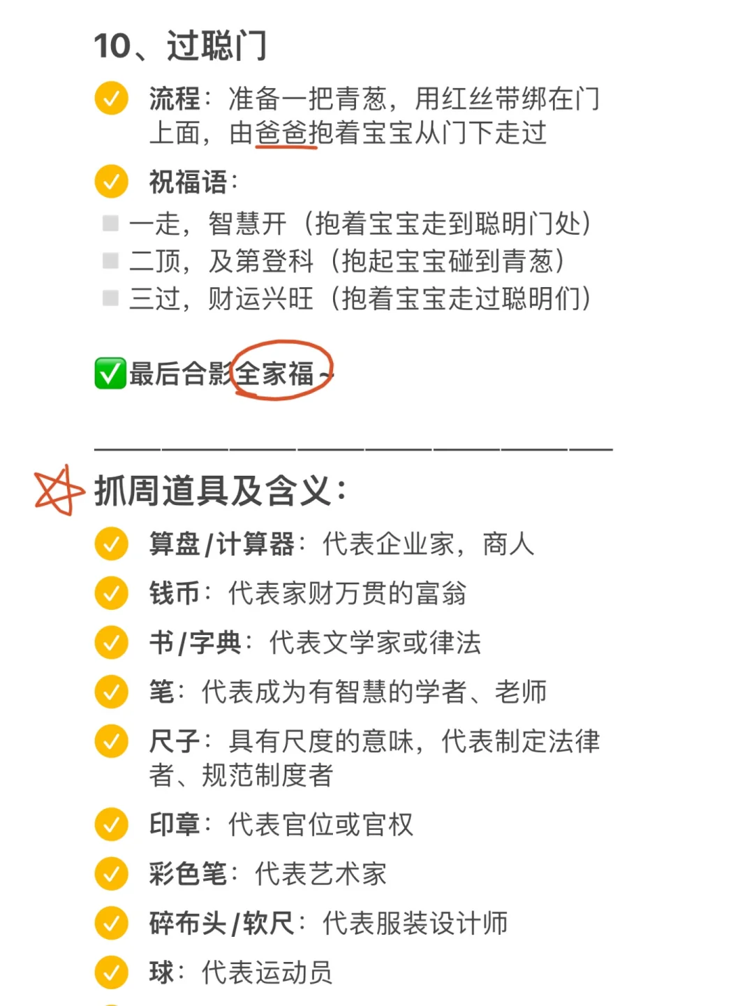 . 👉新手妈妈建议收藏哦 👉宝宝周岁宴攻略 👉一篇全看懂‼️ . ⭕️流程: 1、净手 2、滚灾 3、冠衣 4、梳头 5、送福 6、抓周(抓周道具在最后一张图) 7、印足 8、食福 9、封酒 10、过聪门 最后合影全家福,宝宝周岁宴就圆满结束啦~ . 我会持续更新孕育干货 关注我,新手妈妈带娃不迷路