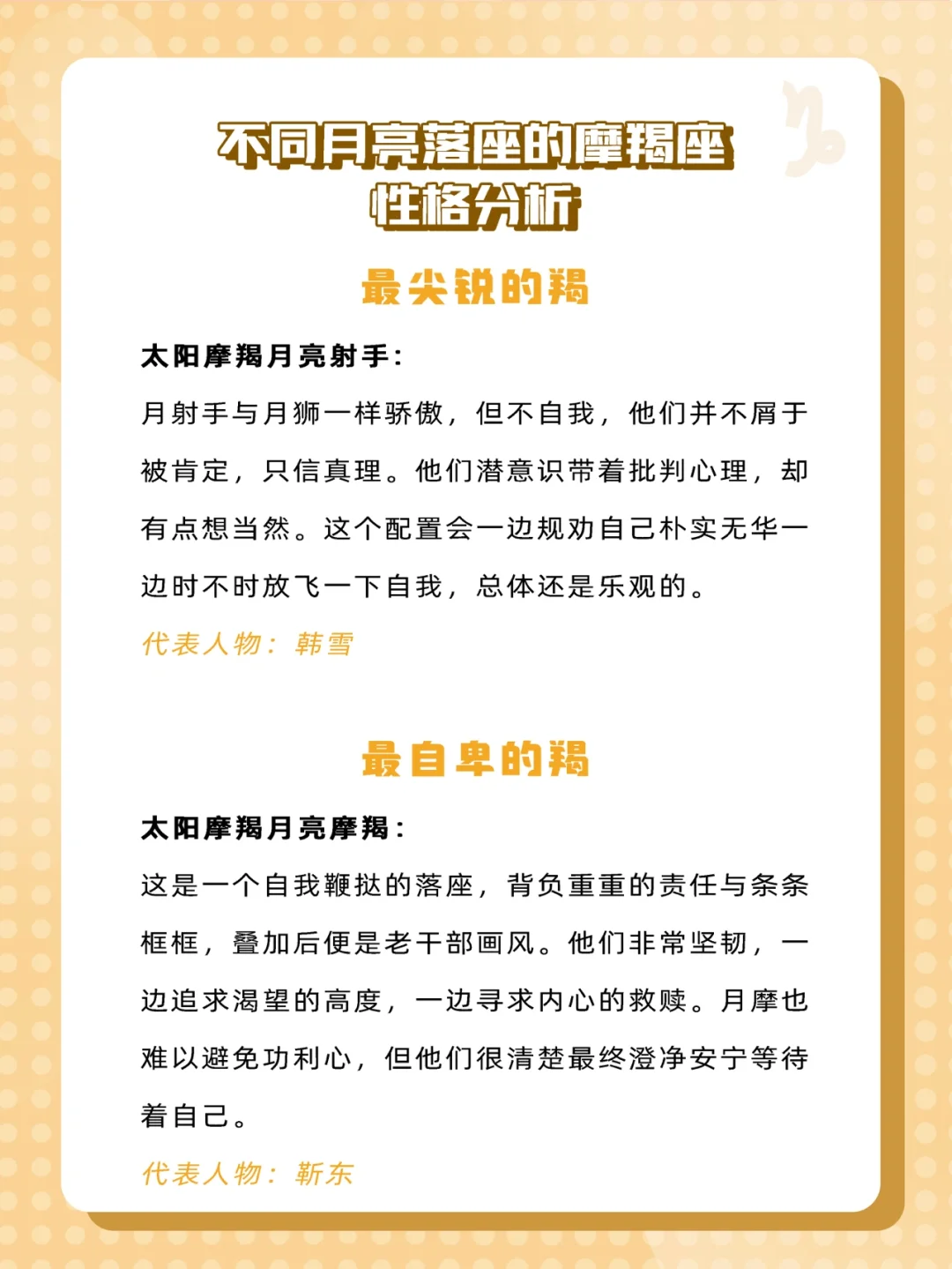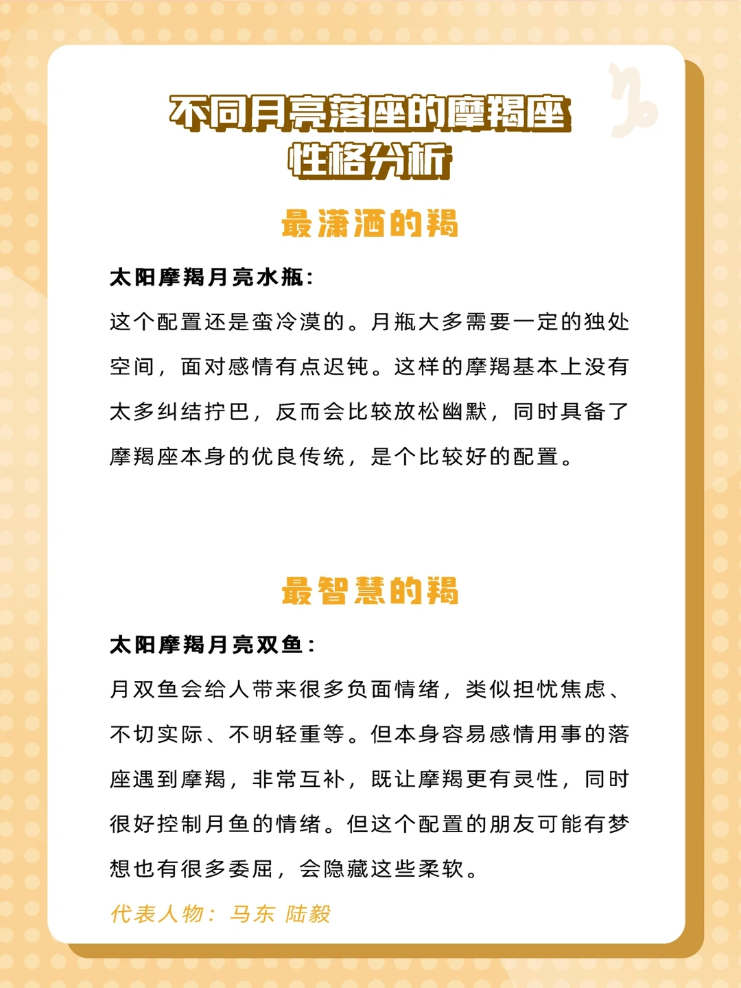 而月亮落座很多时候也意味着内心软肋,虽然在摩羯身上可能不明显,但保护的越完整,其实存在的隐患越大,被控制的真实需求也会无限反弹。所以用一个句式来理解太阳摩羯月亮××性格即:特别渴望(月亮星座特征)的摩羯。