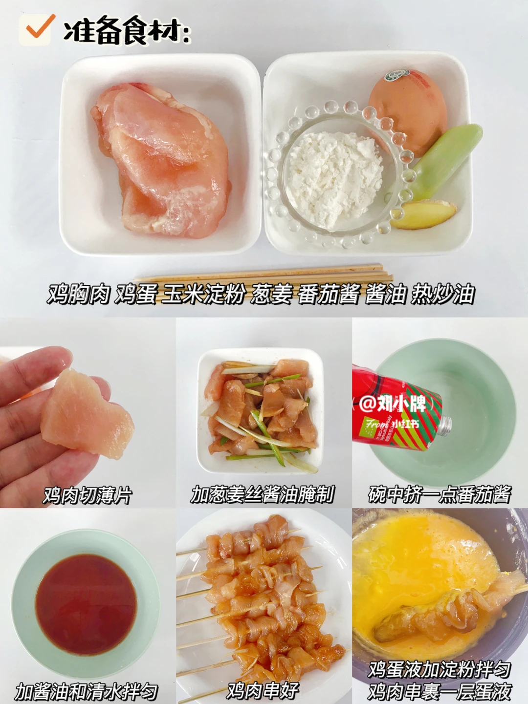 鸡肉、淀粉、鸡蛋、葱姜、番茄酱、酱油、热炒油
