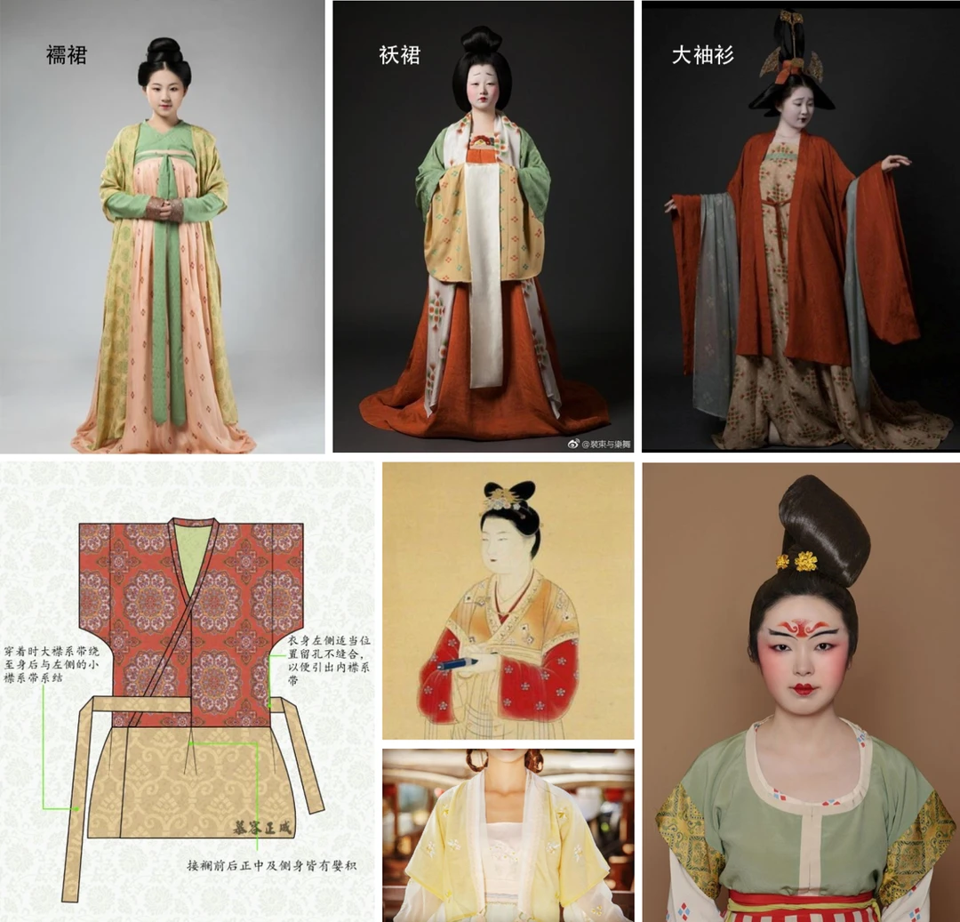 上衣流行窄袖衣样式,对襟、交领、短款、长款各有不同,裙子上挂着圆环配饰,用来压住走路时裙摆的风,叫做玉环绶。