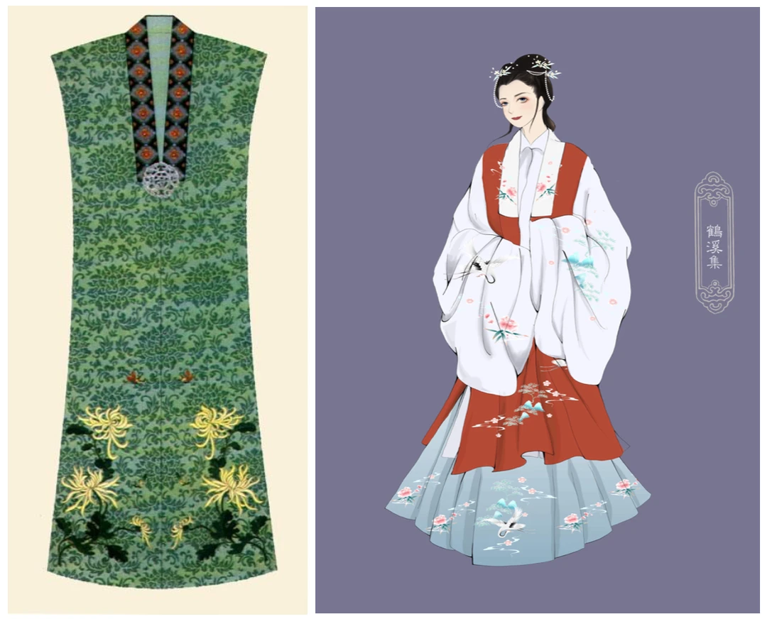 通常右襟裹里面,左襟裹外边,形成深V交领,可以露出里边的衣服。整体下摆越做越宽,要裹好几层,呈现微喇效果,看起来很像蛋糕裙,而且长度还要盖脚。袖子有宽窄两种款式,宽的侧面是圆弧状,代表了天圆地方里的天圆。