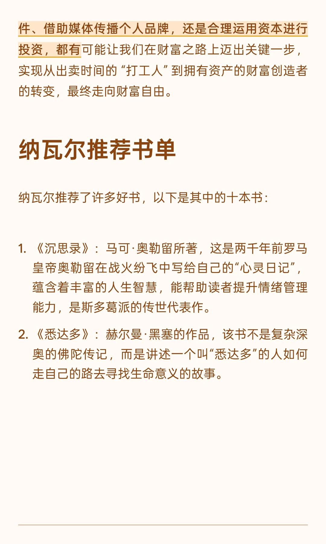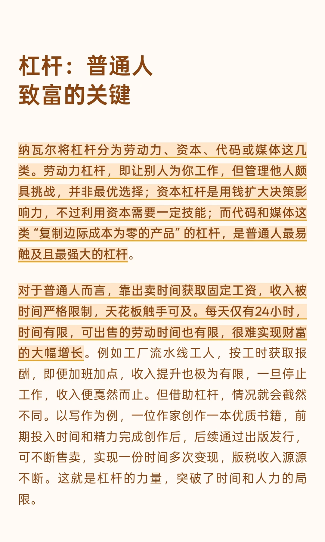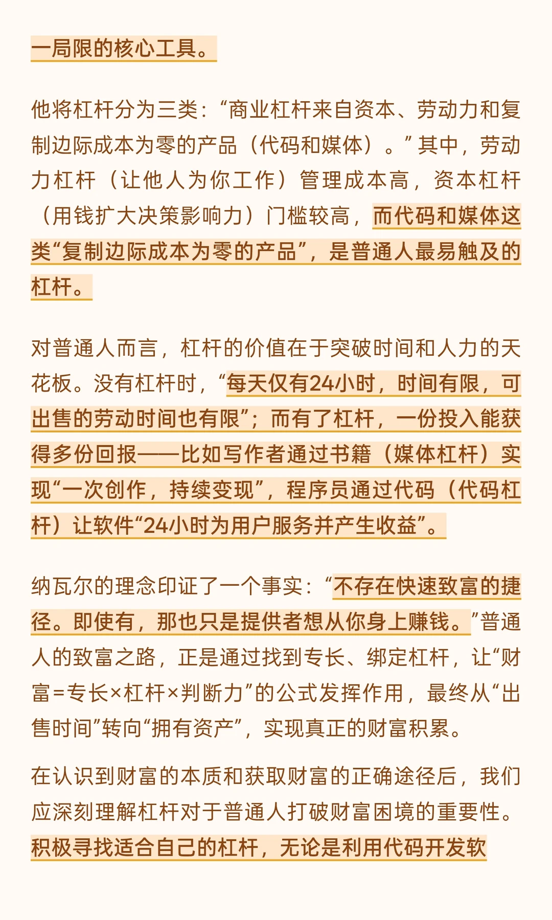 他将杠杆分为三类:“商业杠杆来自资本、劳动力和复制边际成本为零的产品(代码和媒体)。” 其中,劳动力杠杆(让他人为你工作)管理成本高,资本杠杆(用钱扩大决策影响力)门槛较高,而代码和媒体这类“复制边际成本为零的产品”,是普通人最易触及的杠杆。