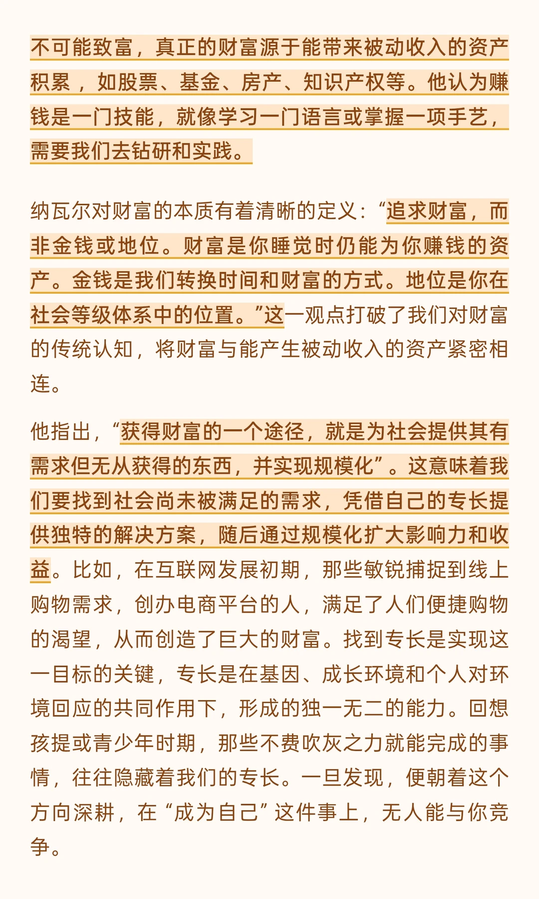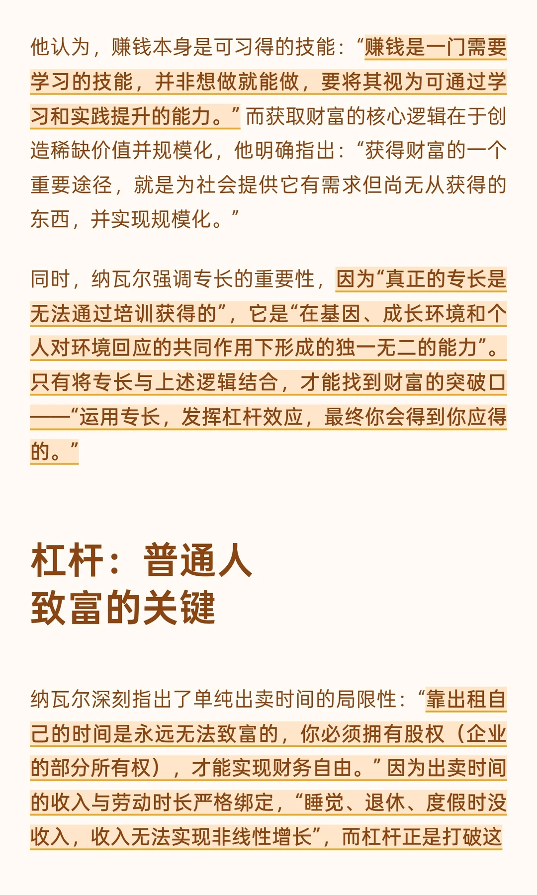 财富源于能带来被动收入的资产,而非金钱或地位。普通人致富需找到专长并绑定杠杆,实现财富积累。杠杆包括劳动力、资本、代码或媒体,普通人可通过这些工具突破时间和人力的局限,实现财富自由。