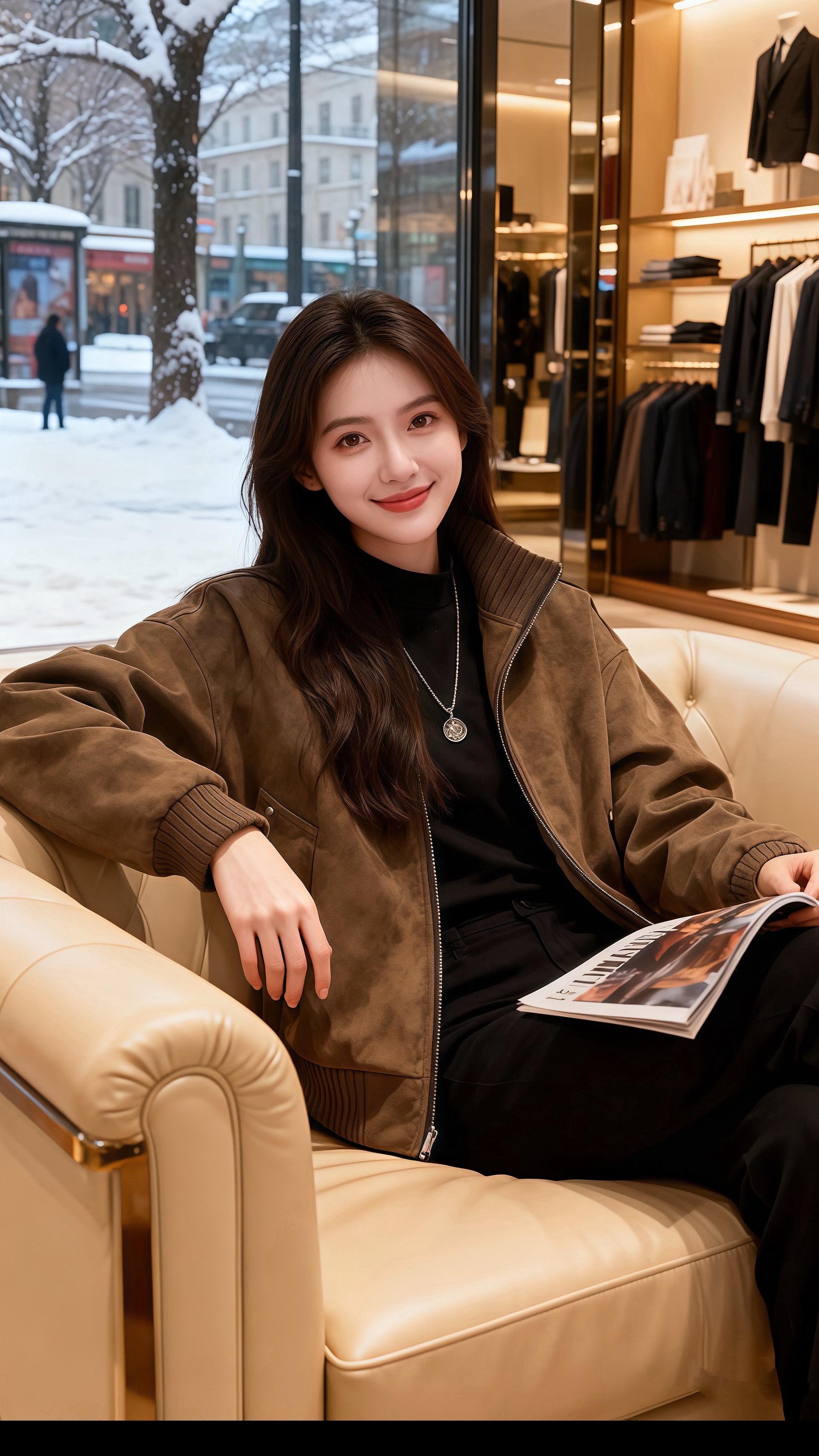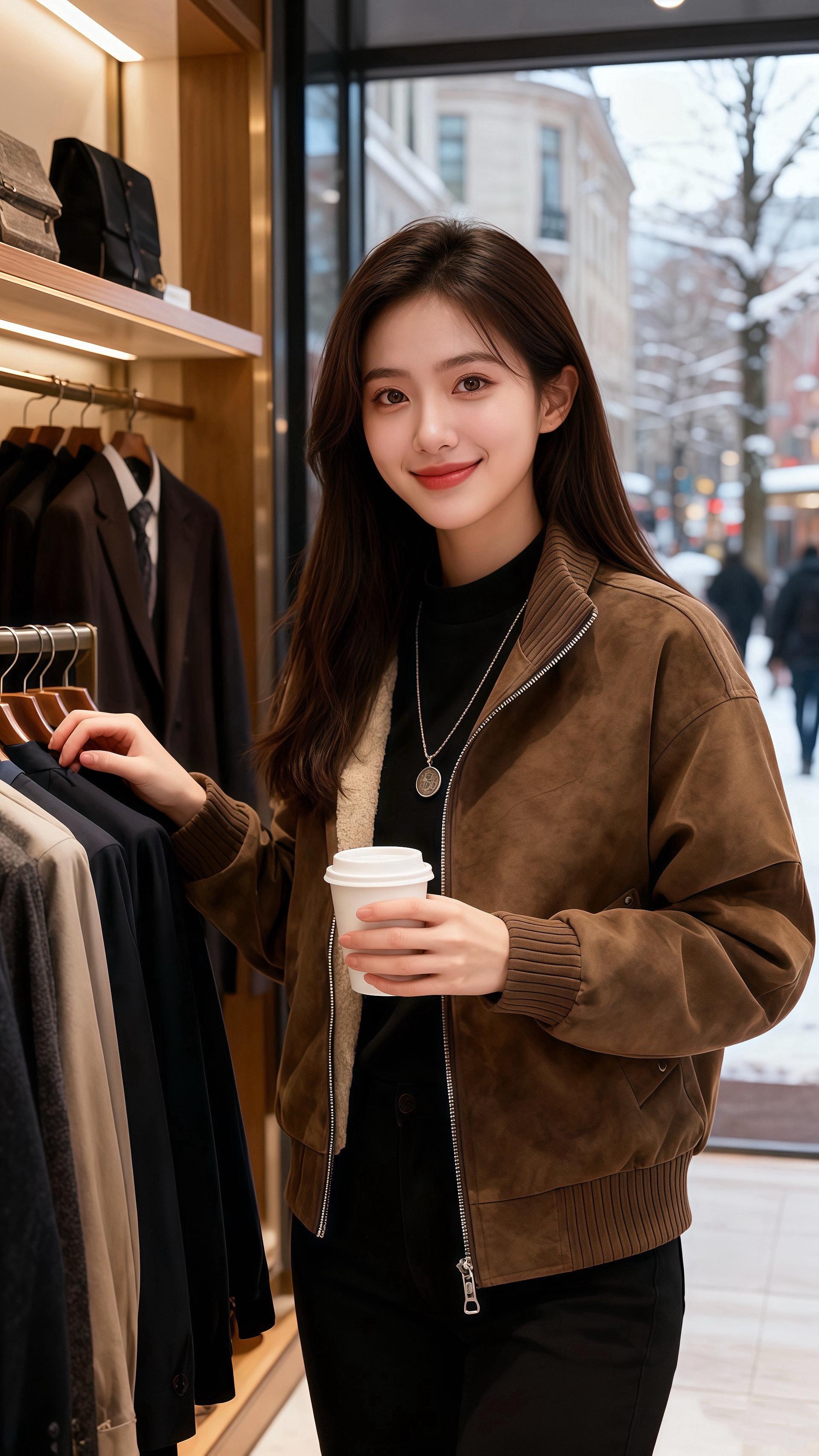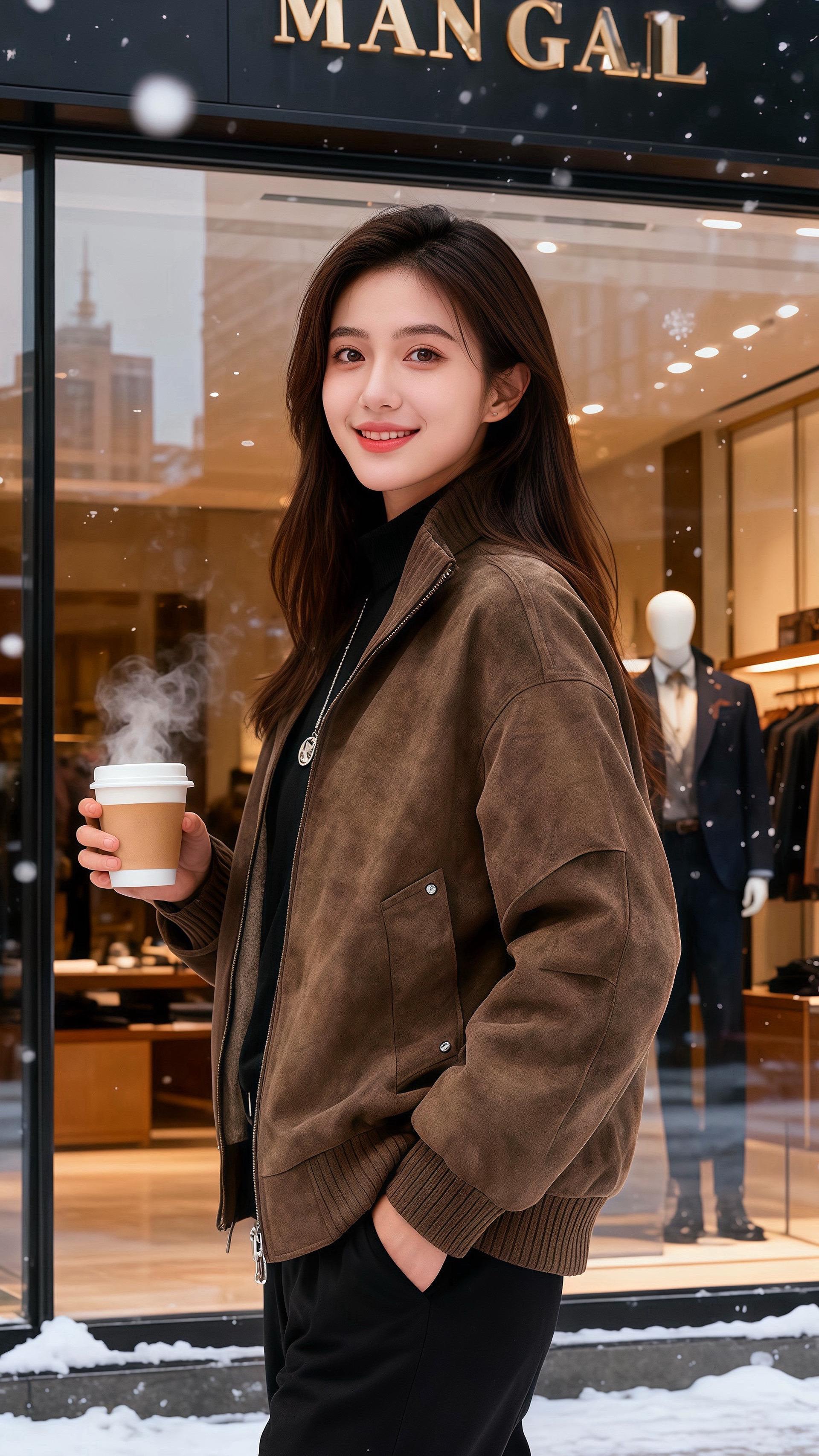 她穿一件米白色加绒外套,利落的拉链半拉着,露出内里柔软的浅咖色绒面,衬得脖颈线条愈发柔和。袖口是低调的螺纹设计,恰好贴合手腕,既不臃肿又透着细心的质感。下身搭配一条浅卡其色直筒裤,裤型利落,衬得双腿笔直,行走间带着恰到好处的松弛感。