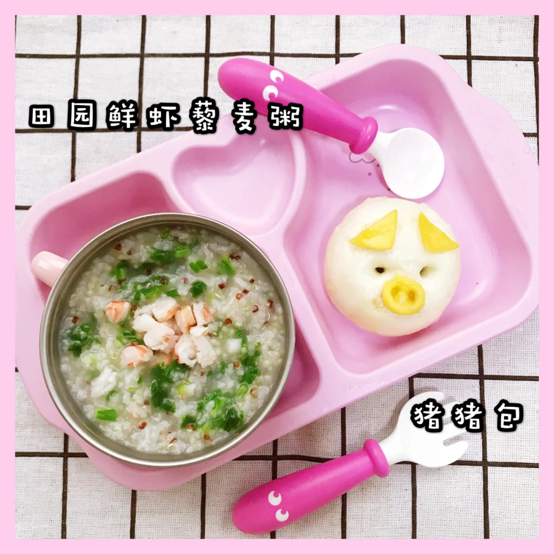 🎀田园鲜虾藜麦粥:藜麦和大米小米一起泡水十分钟,然后煮成粥。加入煮熟的虾仁和青菜,放一点虾皮香菇粉增加味道。