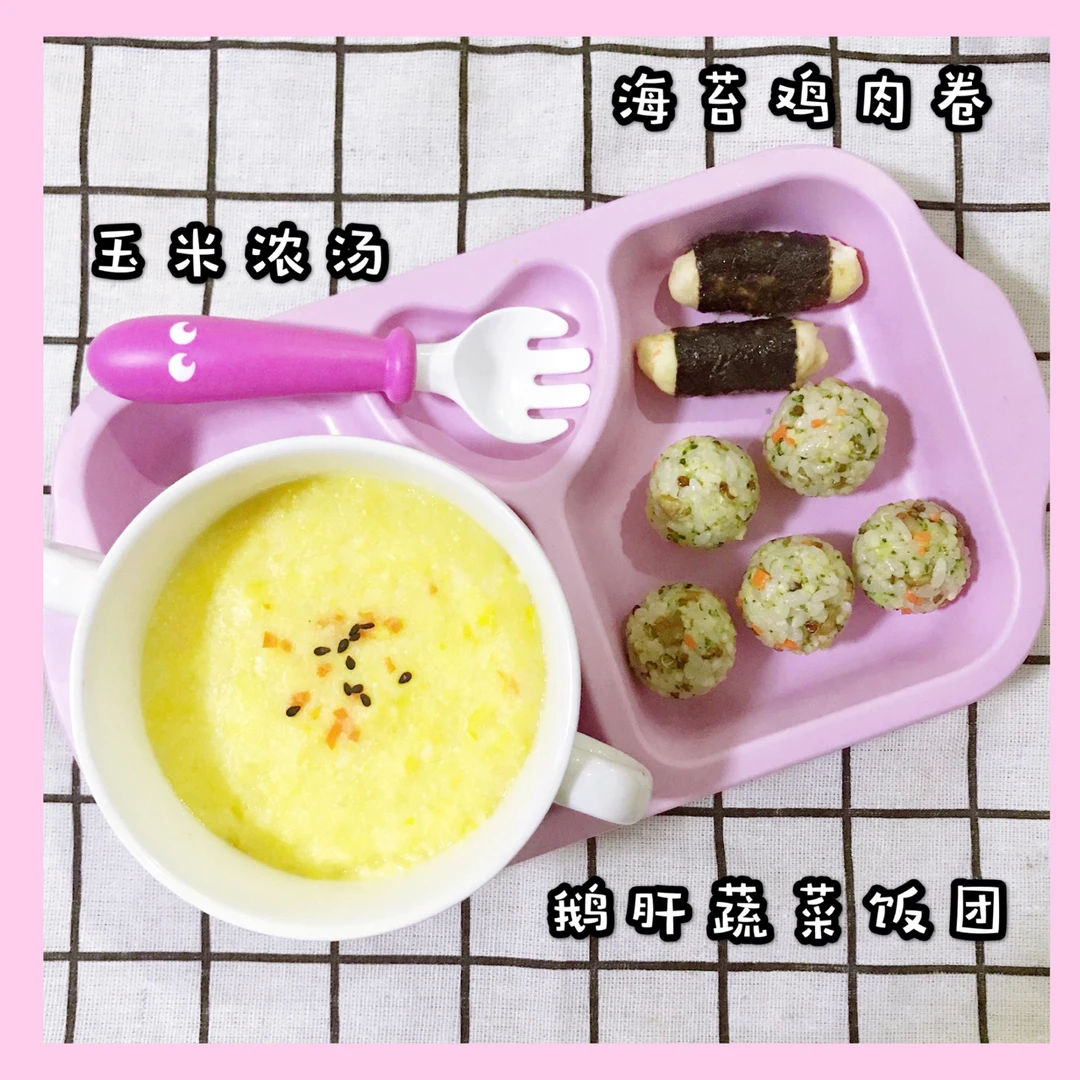 🎀玉米浓汤:玉米粒+牛奶+一点米饭,料理机打成厚厚的糊糊即可。
