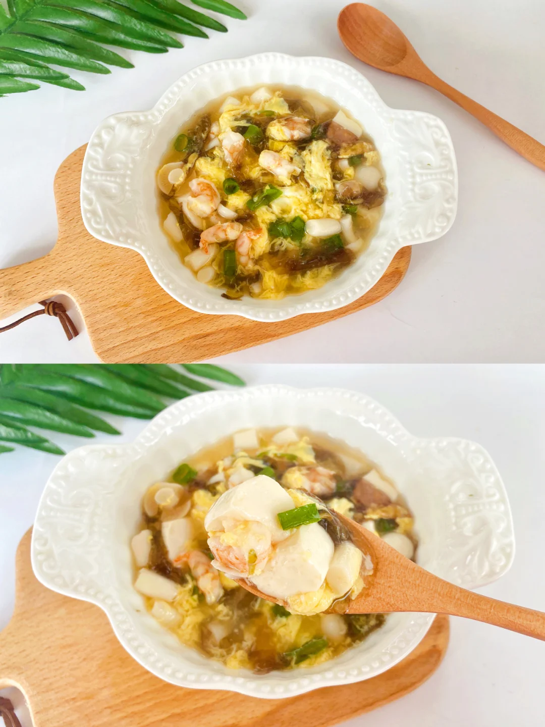 5.汤汁煮制浓稠后淋入蛋液,浇在蒸好的豆腐上,拌匀就可以吃啦。