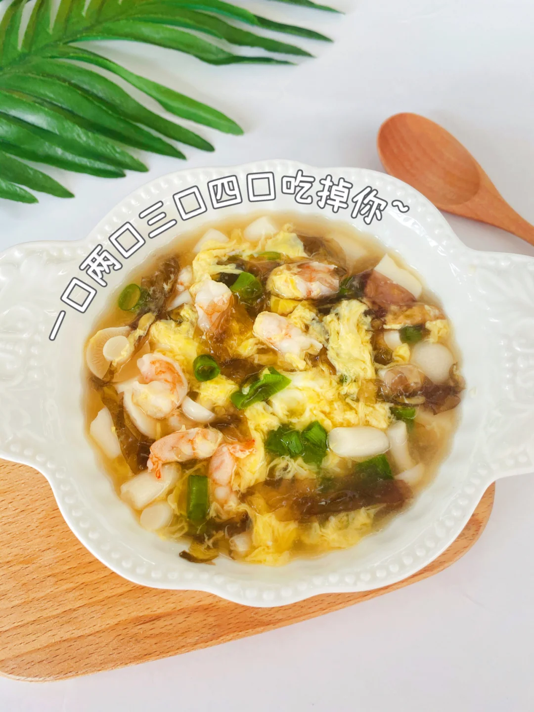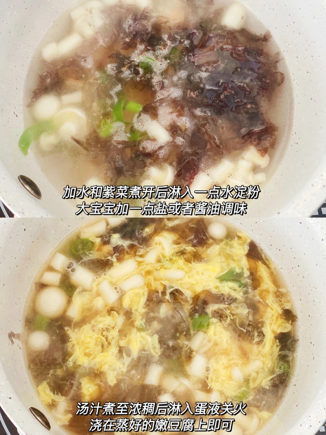 4.加水和紫菜,煮开后淋入水淀粉,大宝宝加一点盐和酱油调味。