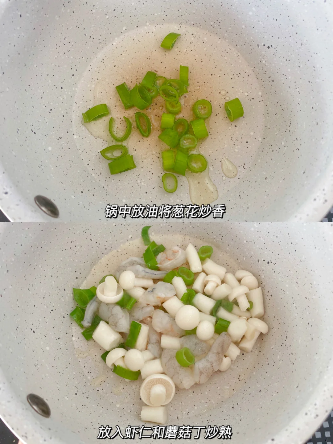 3.锅中放油将葱花炒香,加入蘑菇和虾仁炒熟。