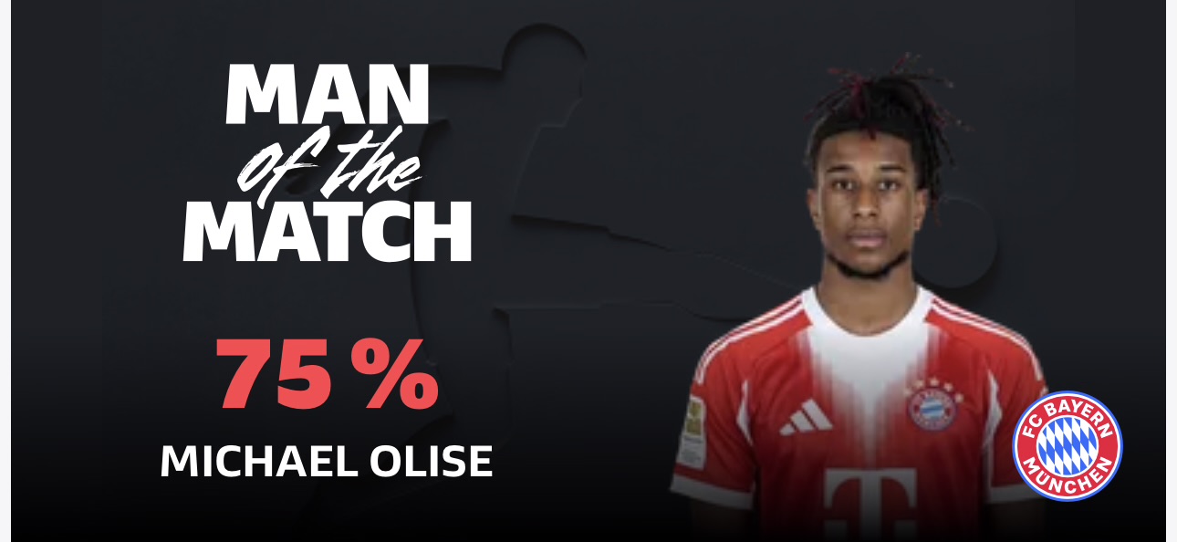 75%得票率,奥利塞当选拜仁6-2弗赖堡全场最佳球员