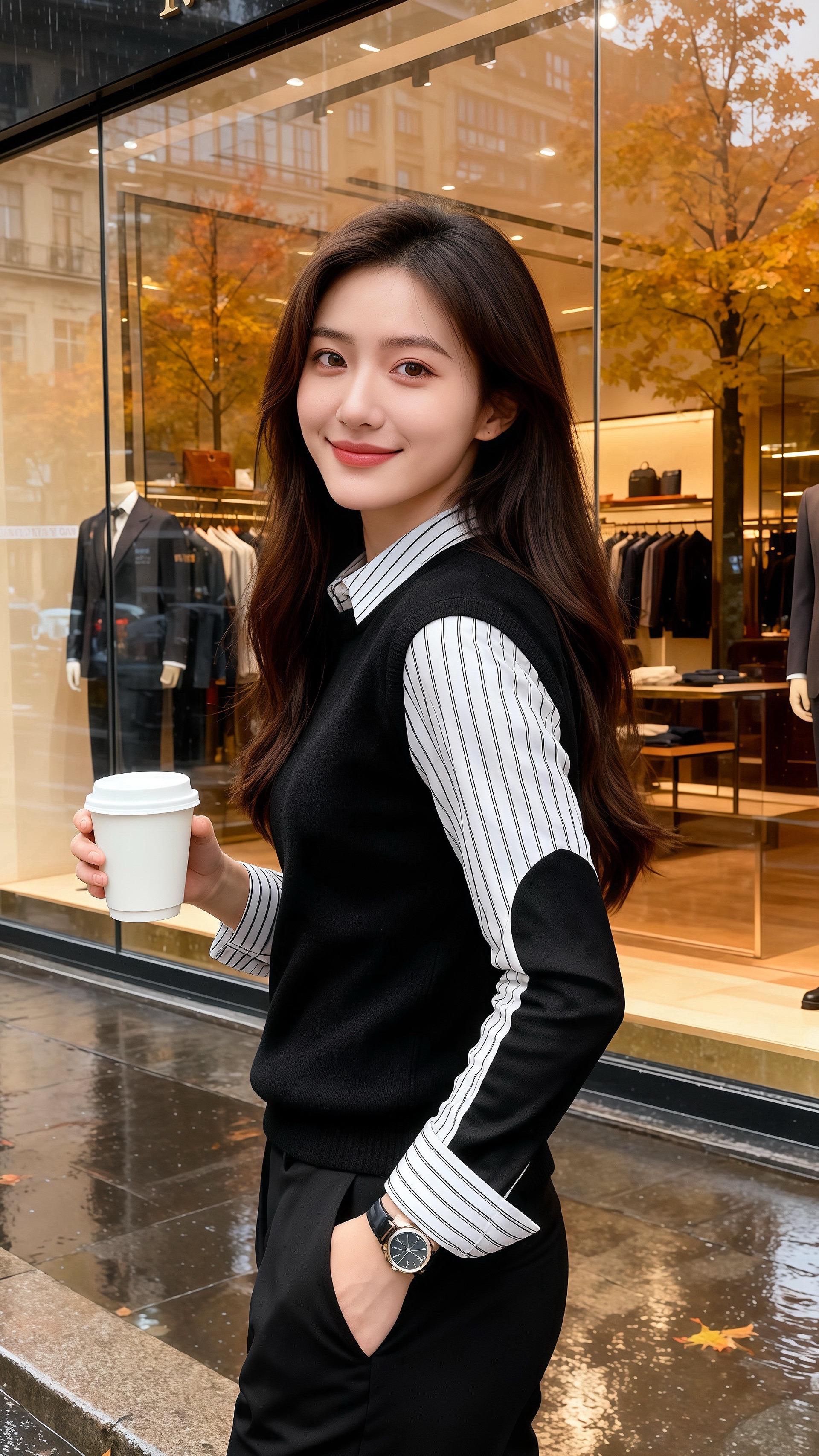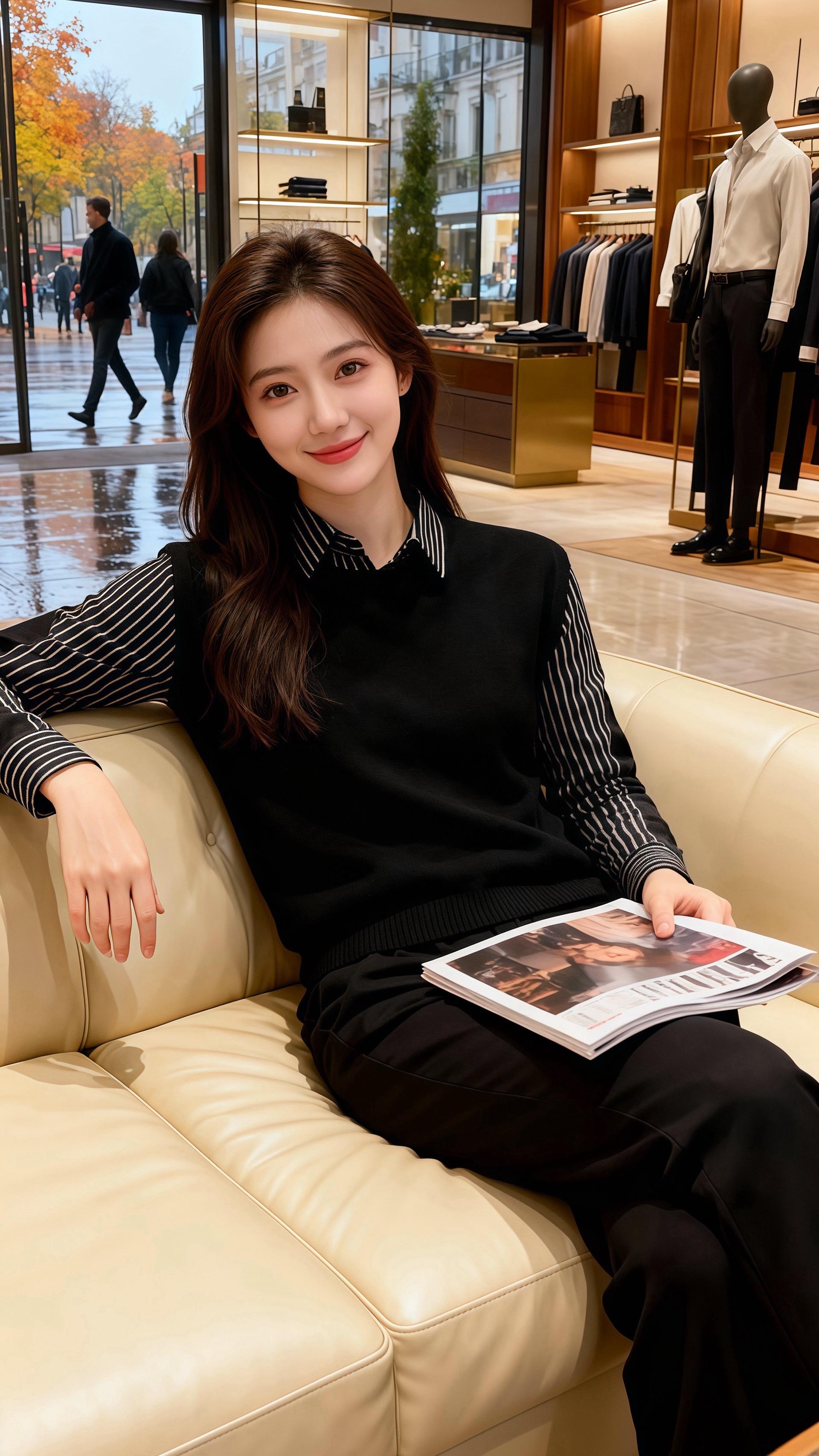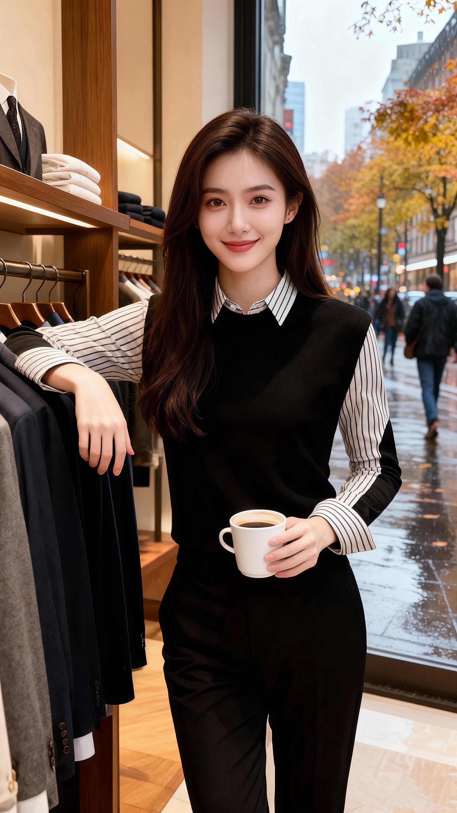 雨丝裹着桂香贴在橱窗时,许妍正窝在店里的沙发上翻杂志。她身上的黑背心叠条纹衬衫,衬得秋日都利落——背心的针织软而不塌,衬衫袖口刚好露出细腕,配着宽腿黑裤,松弛里裹着温温的质感。