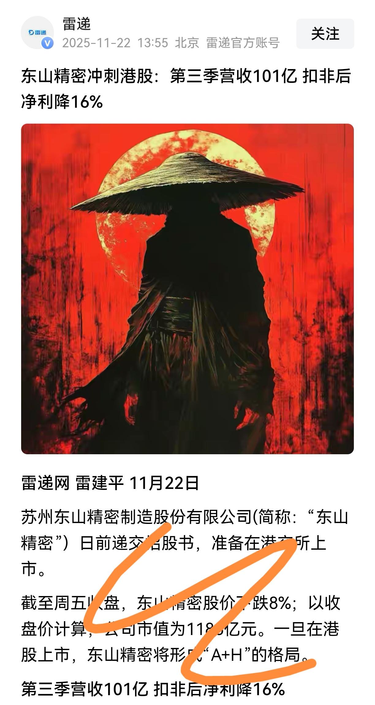千亿巨头的“二次创业”:拿下AI算力“入场券”!这家中国工厂藏不住了,或是英伟达链上“新贵” 听说东山精密要去香港上市了?这家在深圳已经上市十几年的千亿巨头,如今要双线作战。但这步棋,下得正是时候! 这家从苏州小镇走出的钣金小厂,是如何成长为业务遍布全球的千亿巨头?在深交所上市15年后,它的创始人袁永刚家族,做出了一个重大的决定:挥师南下,赴港上市。这并非一次简单的融资,而是一次在营收破百亿高光下,直面“利润下滑”挑战的主动破局。 有人说,它最近“增收不增利”——营收破百亿,但净利润有点下滑。要我说,这得看你怎么看。 它现在就像个练肌肉的壮汉,体重在增加(营收涨),但短期力量指标(利润)没那么好看。为啥?因为它在买更好的装备、学更牛的招式! 这三年,它的毛利率确实从16%掉到了11%。但这背后,是它在AI、新能源汽车这些未来赛道疯狂布局。现在的投入,都是为了将来能跳得更高。 它的三张王牌,张张都打在了风口上 东山精密不瞎搞,它的三块业务,布局相当精明: ①电路板(PCB):这是它的“老本行”,也是“现金牛”。 占收入的65%,稳得一批。有这块业务托底,它才有底气去闯新天地。 ②光模块:这是它的“未来票”。 刚收购来的索尔思光电,让它一脚踩进了最火的AI算力赛道。这玩意儿是数据中心的高速公路,需求正在爆发前夜。 ③新能源汽车零件:这是它的“新赛道”。 电动车越来越普及,需要的精密零件越来越多。它凭借制造老底子,成功挤进了这条黄金赛道。 这三块业务,不是胡乱撒网,而是互相配合:老业务赚钱养家,新业务貌美如花。 去香港上市,图的不只是钱 去香港,真不只是为了融那点钱。格局打开,它的野心更大: ①打造国际身份证:在香港上市,等于向全球客户和投资者喊话:我来了!品牌形象瞬间国际化。 ②吸引全球人才:用国际平台的股权激励,挖顶尖技术大牛,这买卖划算。 ③储备弹药库:未来要研发、要并购,手里有粮心里不慌。港股就是它的超级弹药库。 现在的东山精密,就像马拉松选手在中途补水补能量。速度看似慢了点,但这是为了后半程冲刺蓄力。 短期利润波动很正常,关键是它选的路对不对。从电路板到光模块,从传统制造到AI、新能源,它的每一步都踩在了时代发展的节奏上。 这家公司的故事告诉我们:评价一家企业,不能只看下一个季度的报表,更要看它有没有在正确的路上狂奔。东山精密的港股之旅,就是它“二次创业”的开始。 对中国制造来说,我们需要更多这样敢于投资未来、敢于全球竞争的实力派玩家。它的故事,才刚刚进入最精彩的章节!