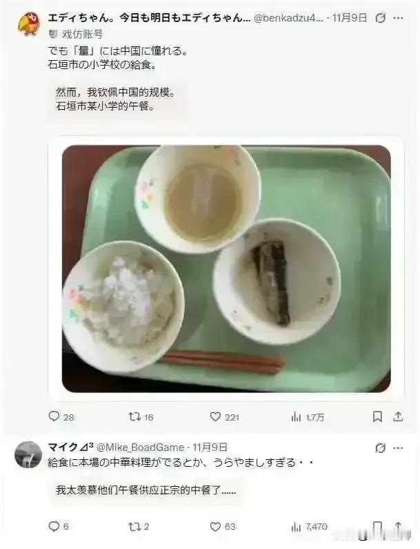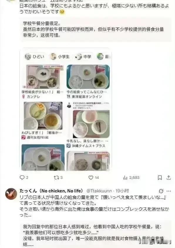 日本社会人情寡淡,世态炎凉,日本华人博主称在日本真的很可能会活活饿死,因为日本社会是不会给任何人帮助,不管是日本政府还是周边的日本人,都不会帮助任何挨饿的人,之前有个新闻学的女精日就在日本的出租屋饿死了,然后还有一群它的同行在它最需要帮助的时候,没人伸出援手,等到它饿死后,它的同行还利用它的死在炒作一番流量!还有一个原因,就是日本的基本生活物资非常昂贵,以至于日本人通过缩小饭量来应对,看了日本学校提供的午餐,比猫吃的还少,这些餐标如果是在国内的学校,起码半年热搜!