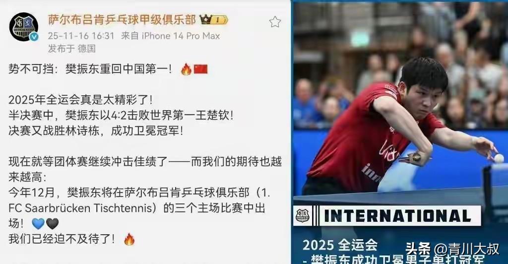 樊振东在全运会十战十胜,各地开始抢人了,最后东北网友说:他咋是东北口音呢? 樊振东夺冠, 没想到萨尔布吕肯第一个跳出来, 祝贺东哥夺金,弱弱问了一句:啥时候回来? 结果这捅了马蜂窝, 上海体育立马表示: 他可是我们的人, 你们别来蹭了! 上海交大不服: 你们闪闪,小胖是我们学生! 上海杨浦一听急了: 你的学生咋了? 他户口可在我这! 广州是个狠人: 直接在广州塔循环播放了! 东北网友急了: 小胖是我们东北人, 不信你听听他口音! 问题来了: 小胖作为广州出生的湖南人, 怎么有东北口音呢?