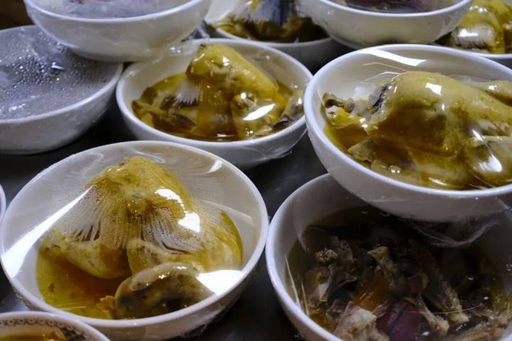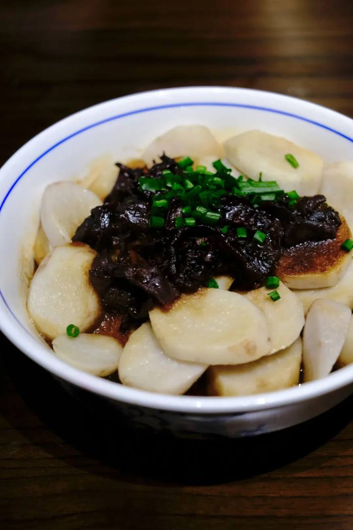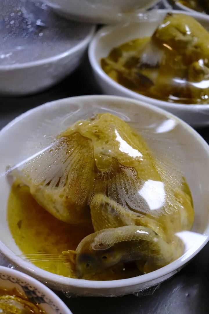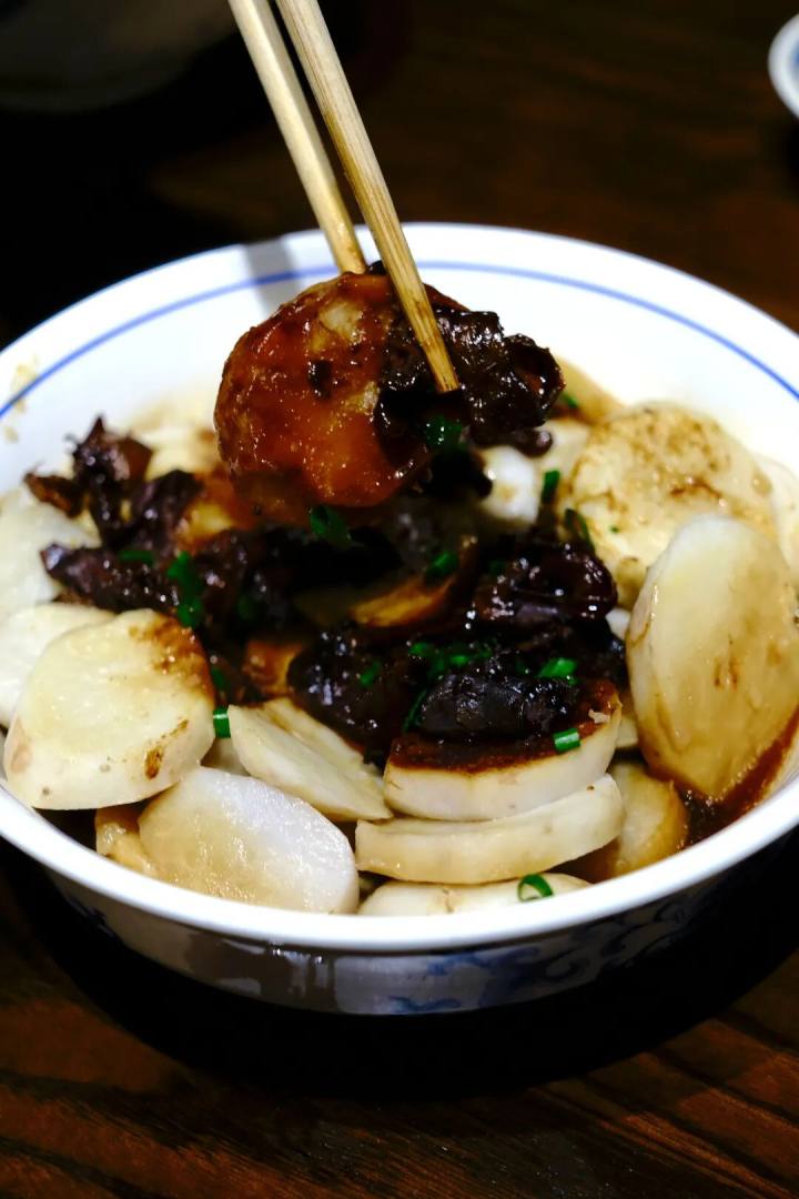鸡冠油则颇费工夫,早上阿姨洗好,洗洗麻烦,再熬猪油渣一样,熬出一半油,加豆瓣酱,进蒸箱蒸,用这个鸡冠油去蒸芋艿才香糯,隔壁桌都闻香望过来。