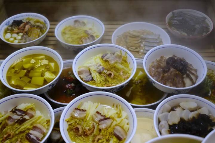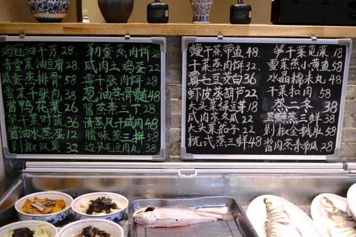 霉毛豆蒸豆腐、鳗干咸带鱼双拼、蒸双臭、蒸茄子、鲞蒸排骨、酱鸭酱肉土香肠三拼、火腿开洋蒸娃娃菜,江河湖鲜,各色水产,统统都有。