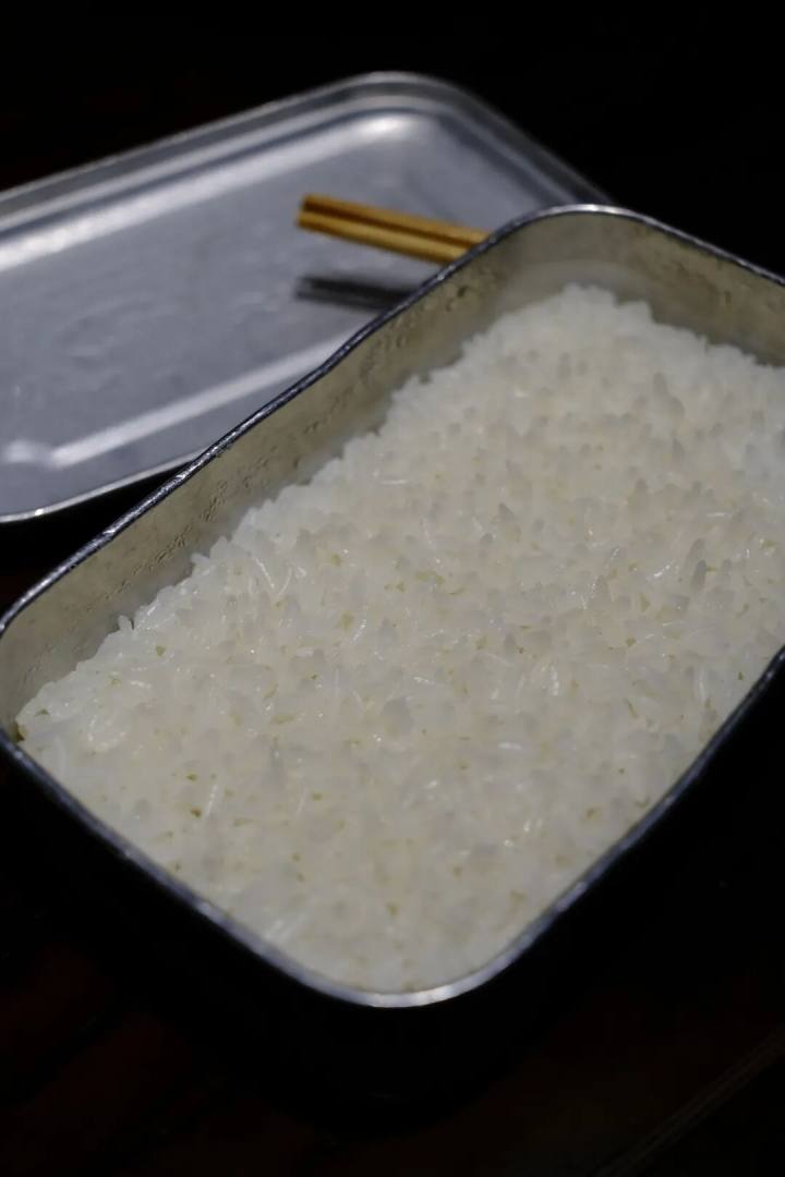 他家米饭有怀旧之风,铝饭盒蒸熟,一人一盒。