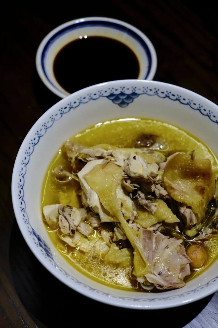 越鸡极嫩,养足6个月的童子鸡,母鸡,有嫩度,又略带嚼劲,扯下一腿,鲜酱油碟一蘸,连皮带肉一抽,剩根骨头。