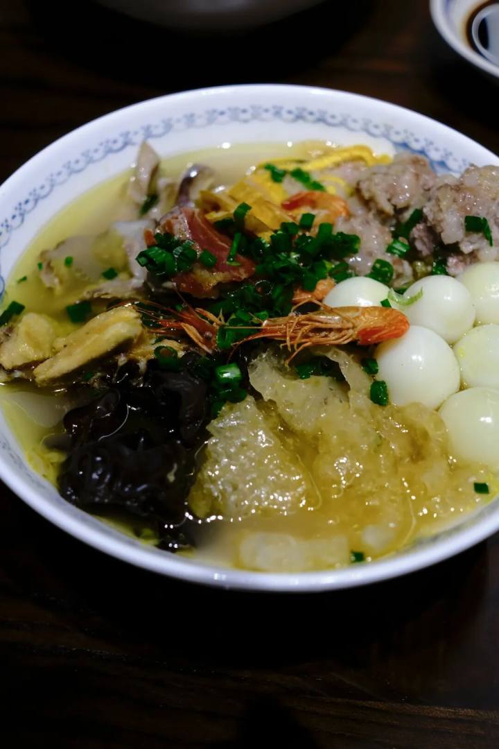 杭三鲜,杭州家家都会做,也是酒楼饭馆常见菜。虽名三鲜,实为多鲜。传统以水发肉皮、鱼茸或肉圆子、熟鸡肉、熟猪肚为主料,辅以黑木耳、娃娃菜、鹌鹑蛋、河虾、笋片诸料,各家各季,各有分野,鲜味荟萃,香爽嫩滑。