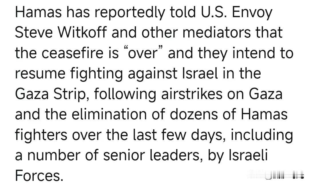 哈马斯已告知美国特使史蒂夫·威特科夫和其他调解人,停火“结束”,他们打算在加沙地
